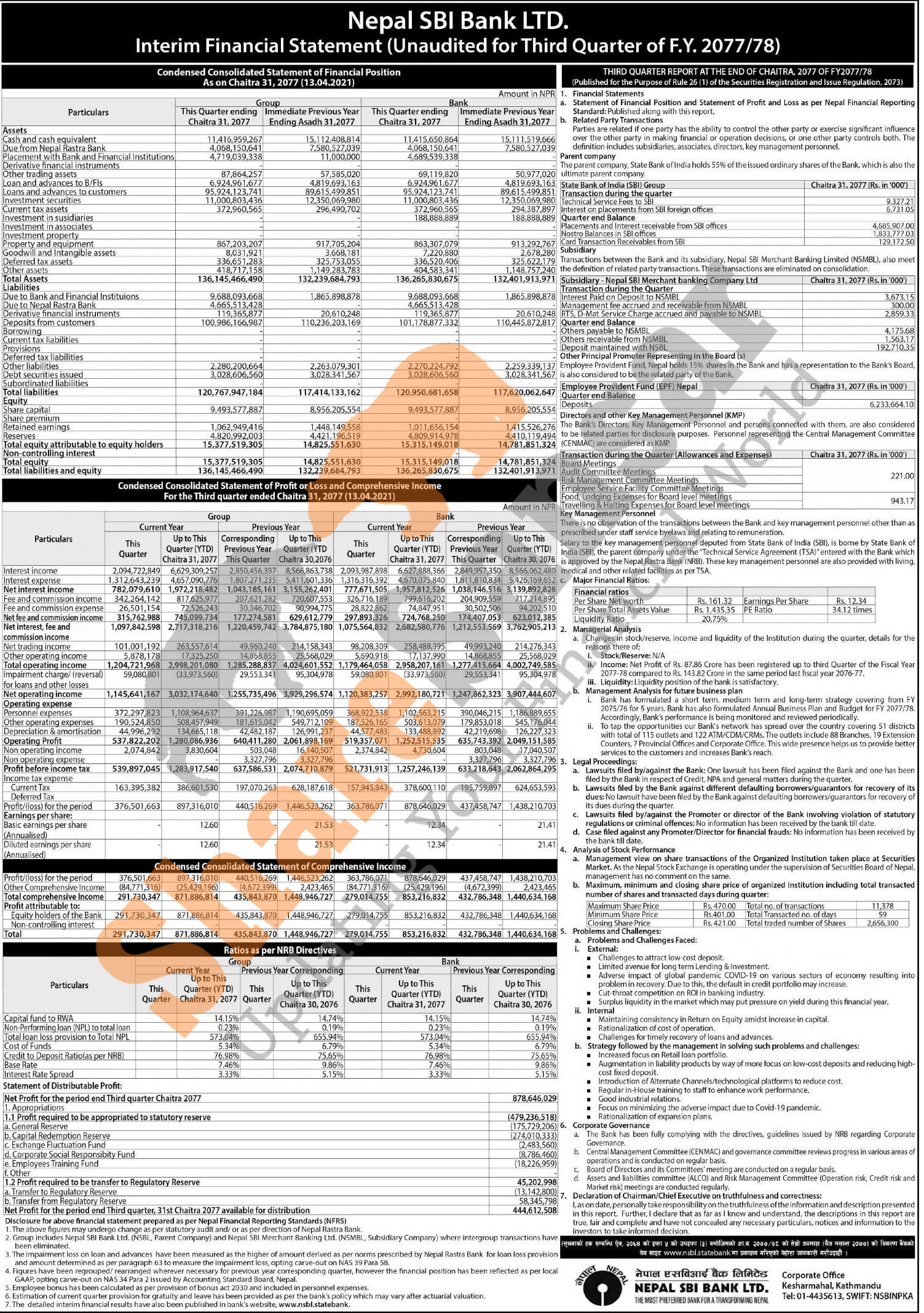 Nepal SBI Bank Limited has posted a net profit of Rs 878.64 million and published its 3rd quarter company analysis of the fiscal year 2077/78.