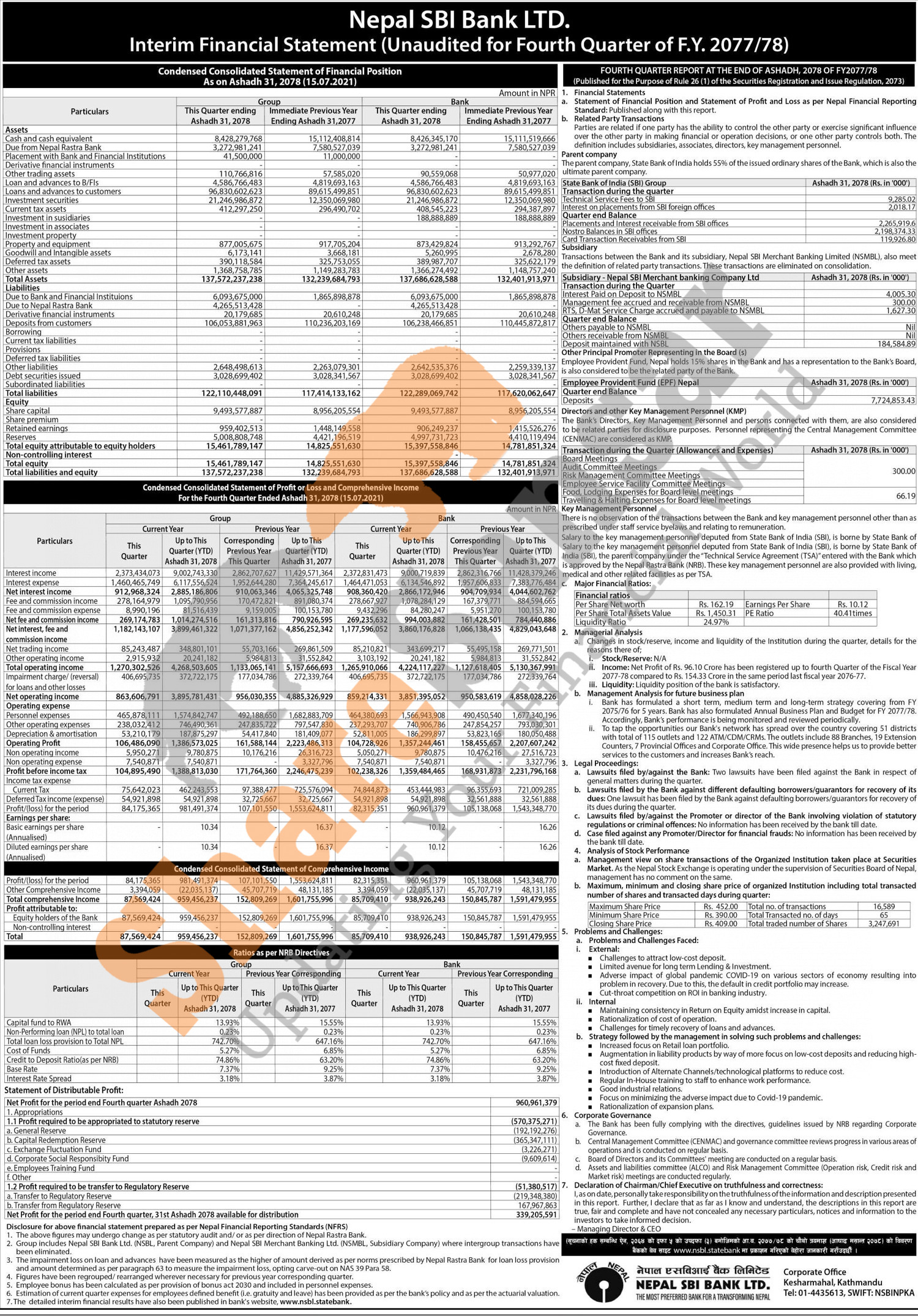 Nepal SBI Bank Limited has posted a net profit of Rs 960.96 million and published its 4th quarter company analysis of the fiscal year 2077/78.