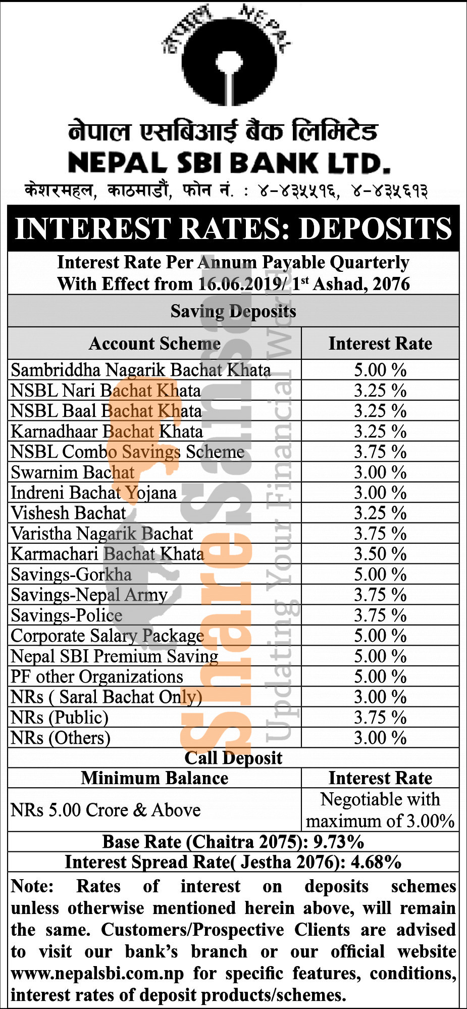 Nepal SBI Bank Limited has published a notice regarding a new interest rate and its effective from 1st Ashad, 2076.