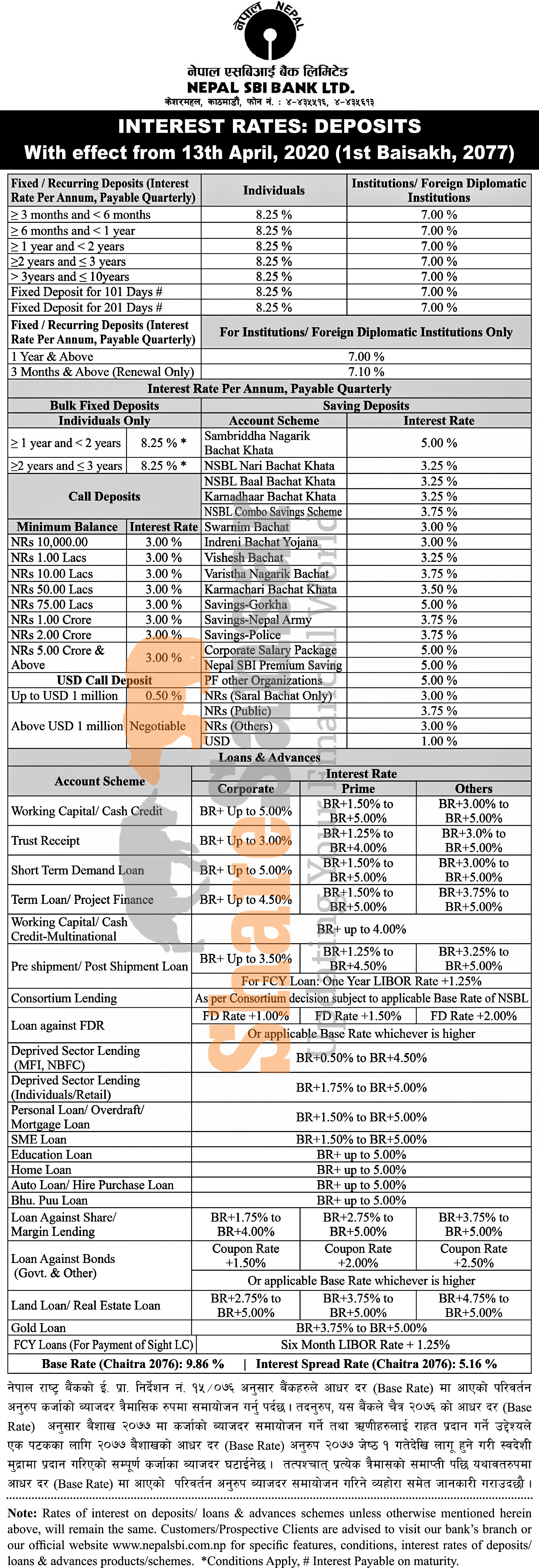 Nepal SBI Bank Limited has published a notice regarding new interest rate and its effective from 1st Baishakh, 2077.