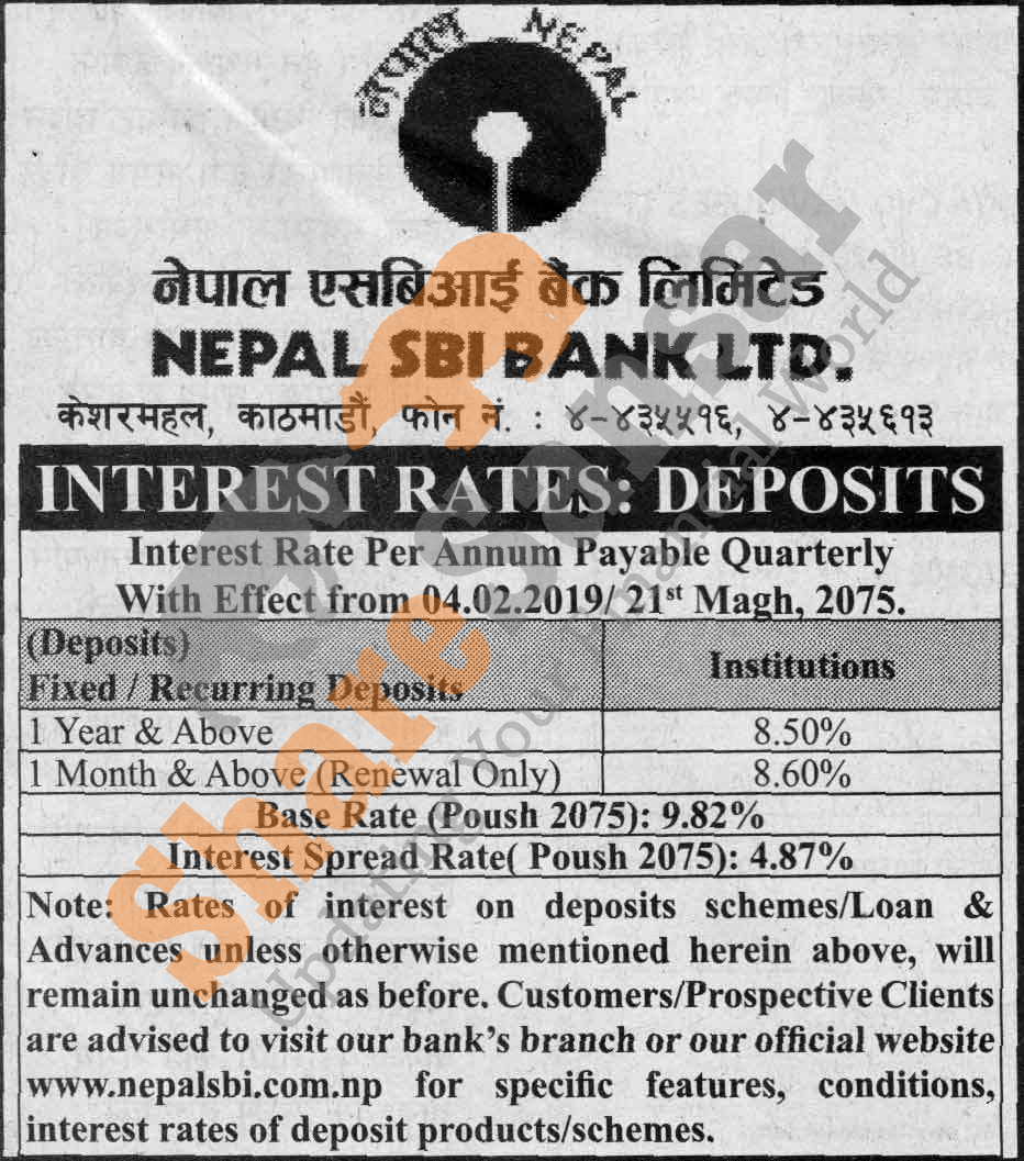 Nepal SBI Bank Limited has published a notice regarding new interest rate and its effective from 21st Magh, 2075.