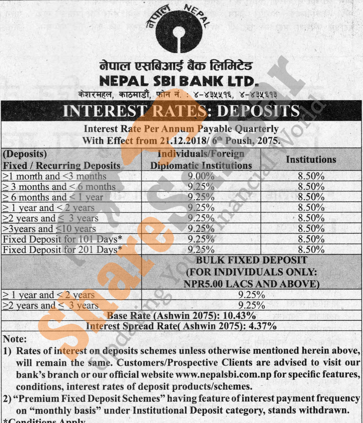 Nepal SBI Bank Limited has published a notice regarding new interest rate and its effective from 6th Poush, 2075.
