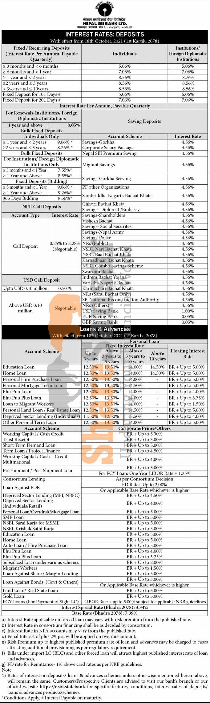 Nepal SBI Bank Limited has published a notice regarding the new interest rate for deposit and loan products and it's effective from 1st Kartik, 2078.