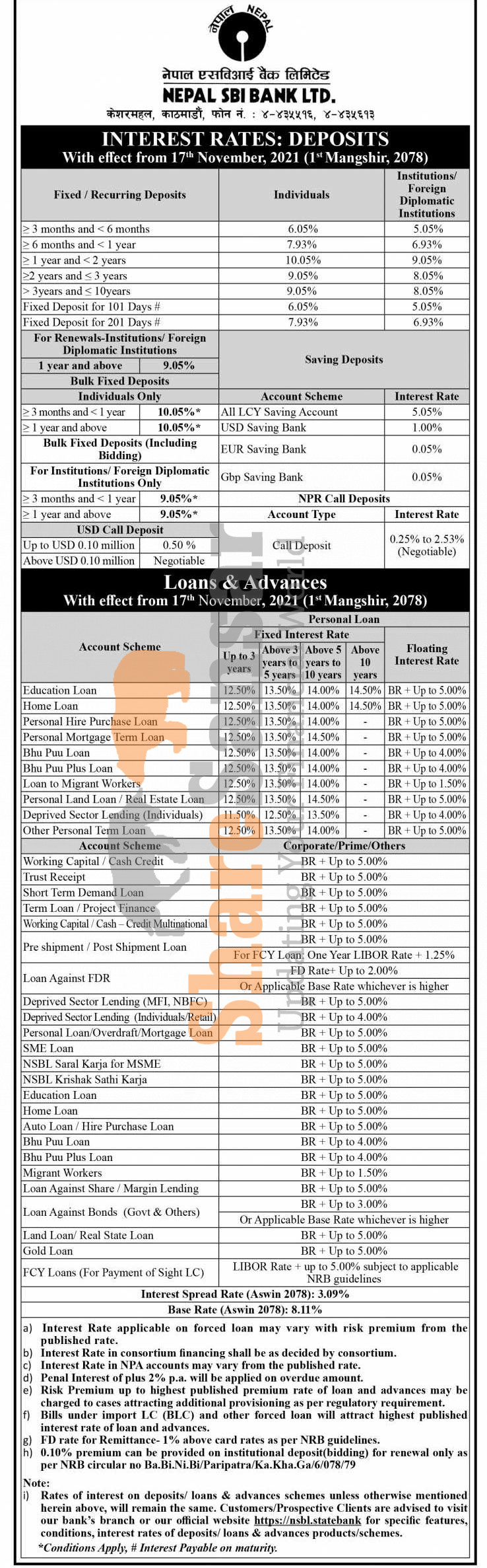 Nepal SBI Bank Limited has published a notice regarding the new interest rate for deposit and loan products and it's effective from 1st Mangsir, 2078.