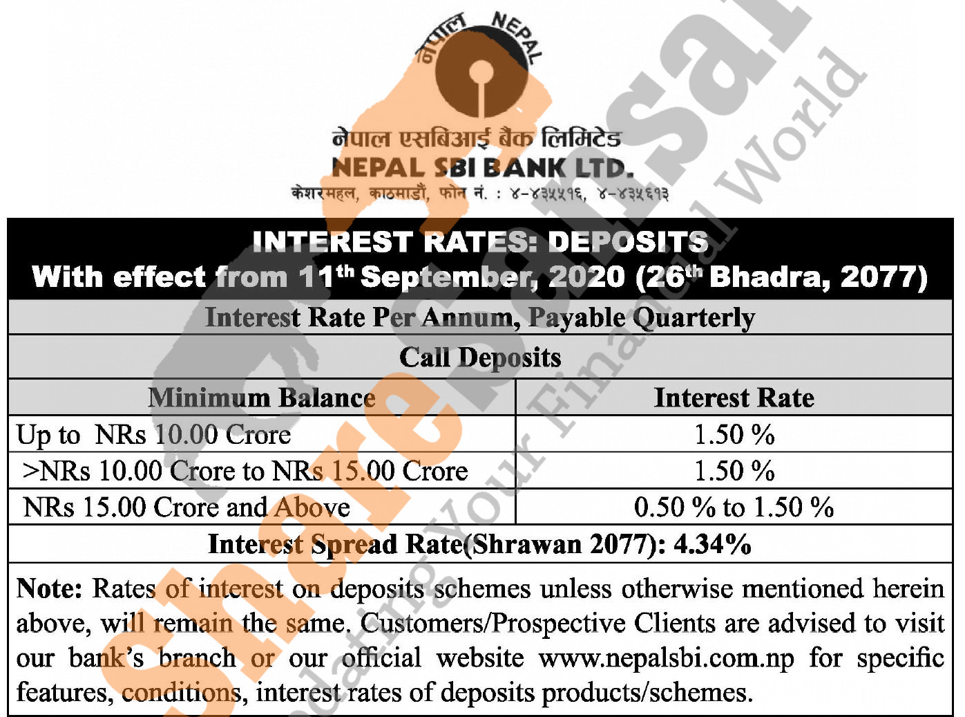 Nepal SBI Bank Limited has published a notice regarding the new interest rate for its deposit product and its effective from 26th Bhadra, 2077.