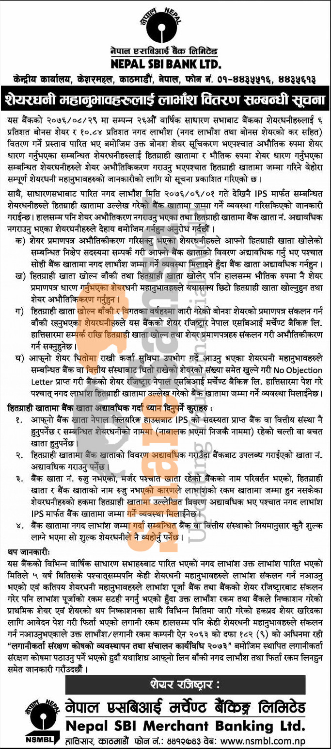 Nepal SBI Bank Limited is distributing 10.84% cash dividend directly to bank accounts to its shareholders and urged its shareholders to dematerialize their shares.