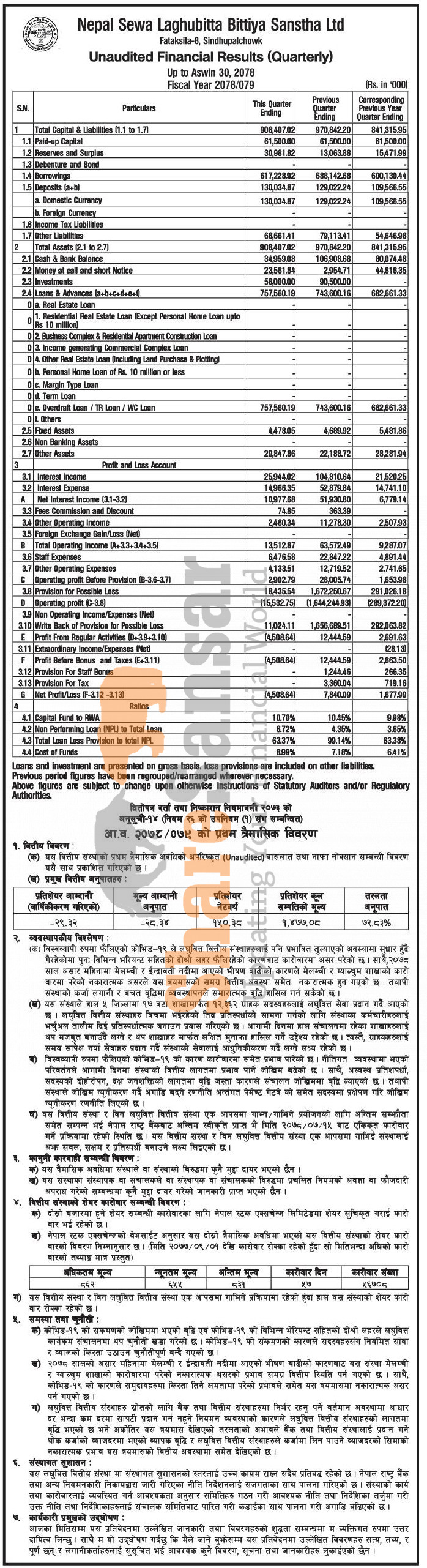 Nepal Sewa Laghubitta Bittiya Sanstha Limited has posted a net loss of Rs 4.50 million and published its 1st quarter company analysis of the fiscal year 2078/79.