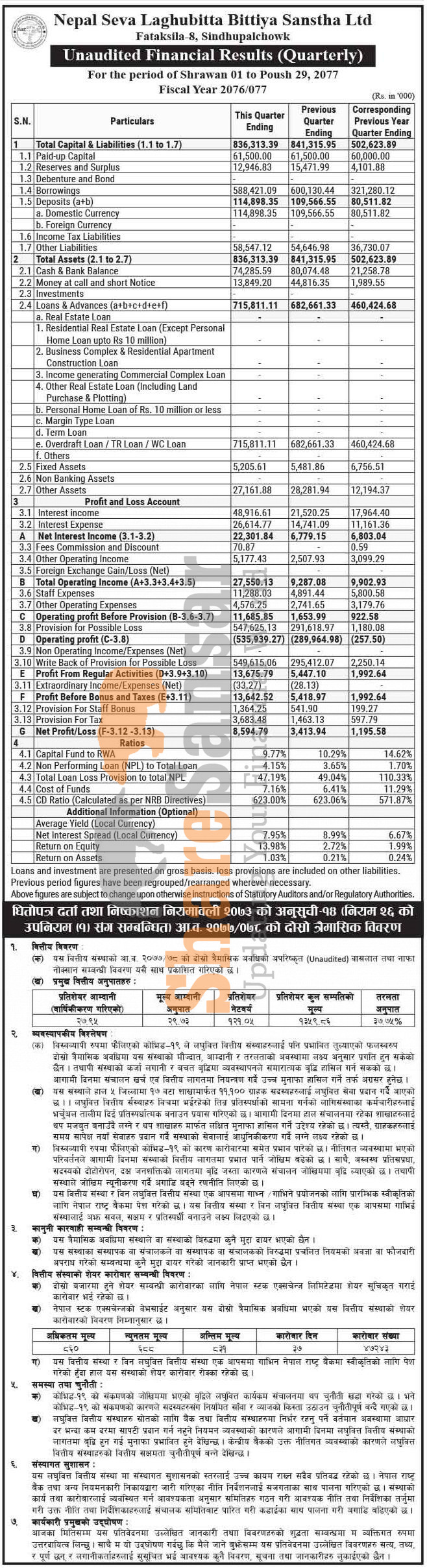 Nepal Sewa Laghubitta Bittiya Sanstha Limited has posted a net profit of Rs 8.59 million and published its 2nd quarter company analysis of the fiscal year 2077/78.