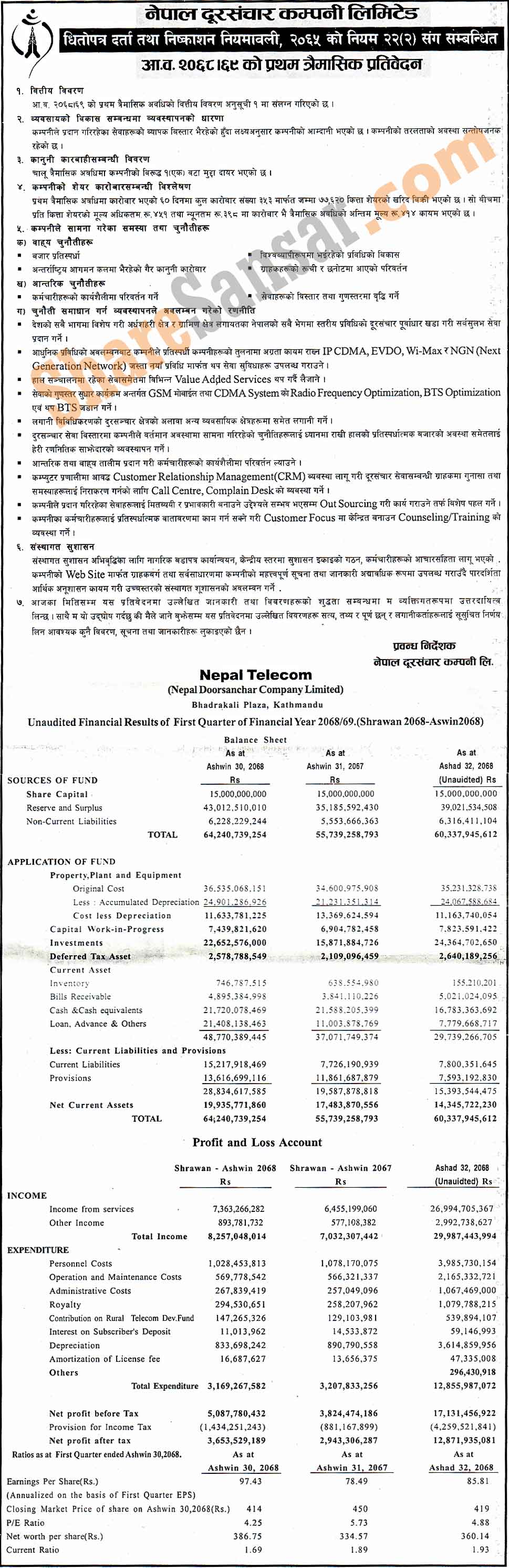Nepal Telecom has posted net profit of Rs.3653.52 million and published its first quarter company analysis of the fiscal year 2068/69.