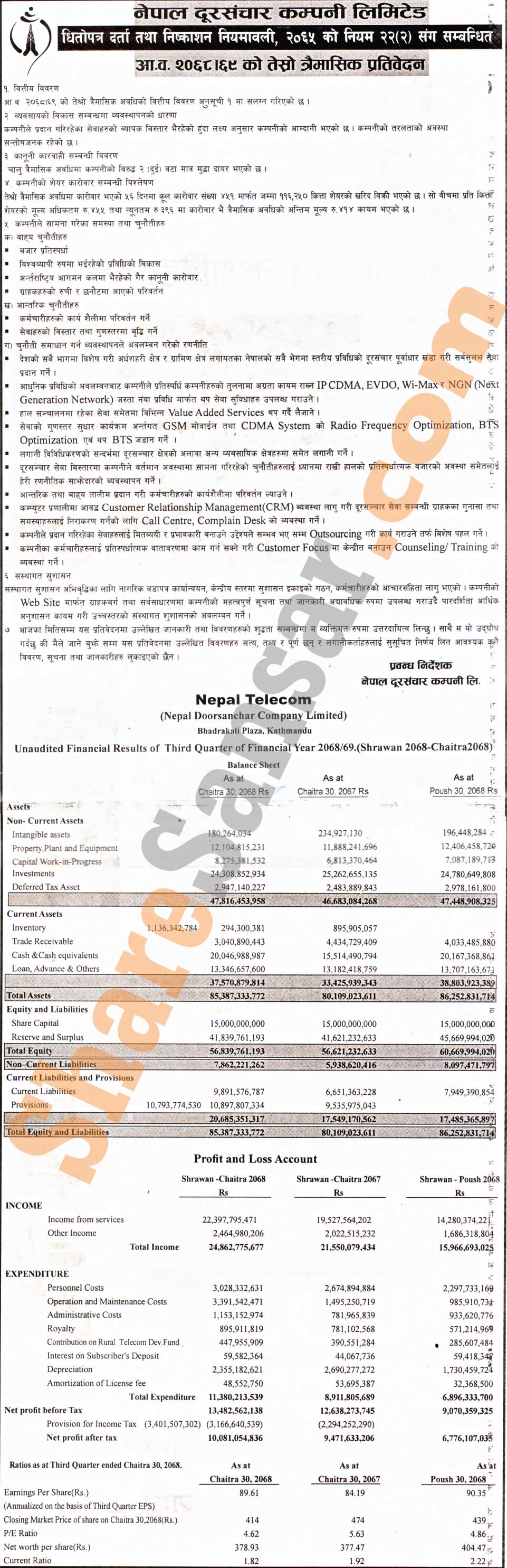 Nepal Telecom Limited has posted net profit of Rs.10,081.05 million and published its third quarter company analysis of the fiscal year 2068/69.