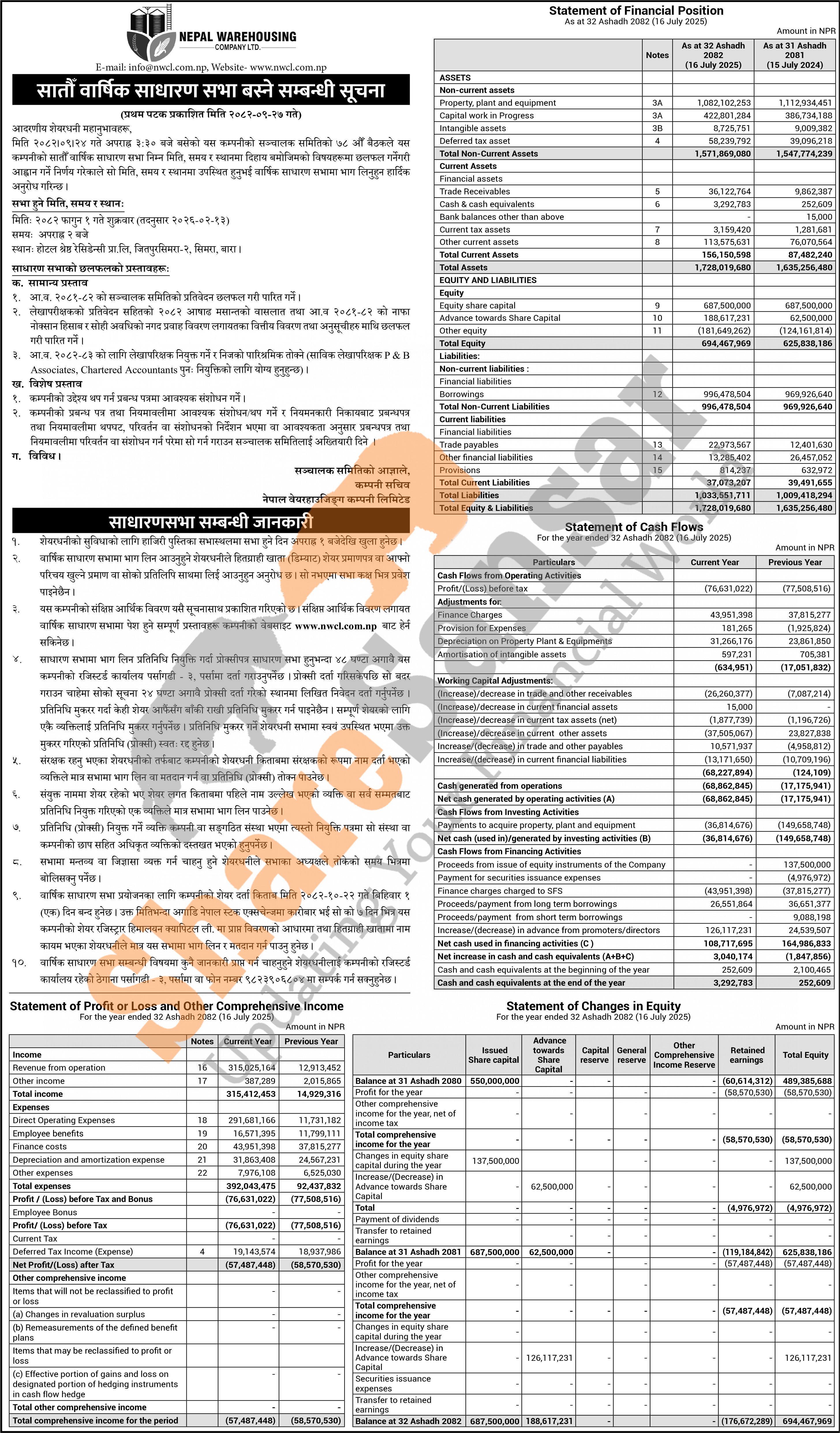 Nepal Warehousing Company Limited has announced its 7th AGM going to be held on 1st Falgun, 2082 and has published its annual financial highlights of the fiscal year 2081/82.