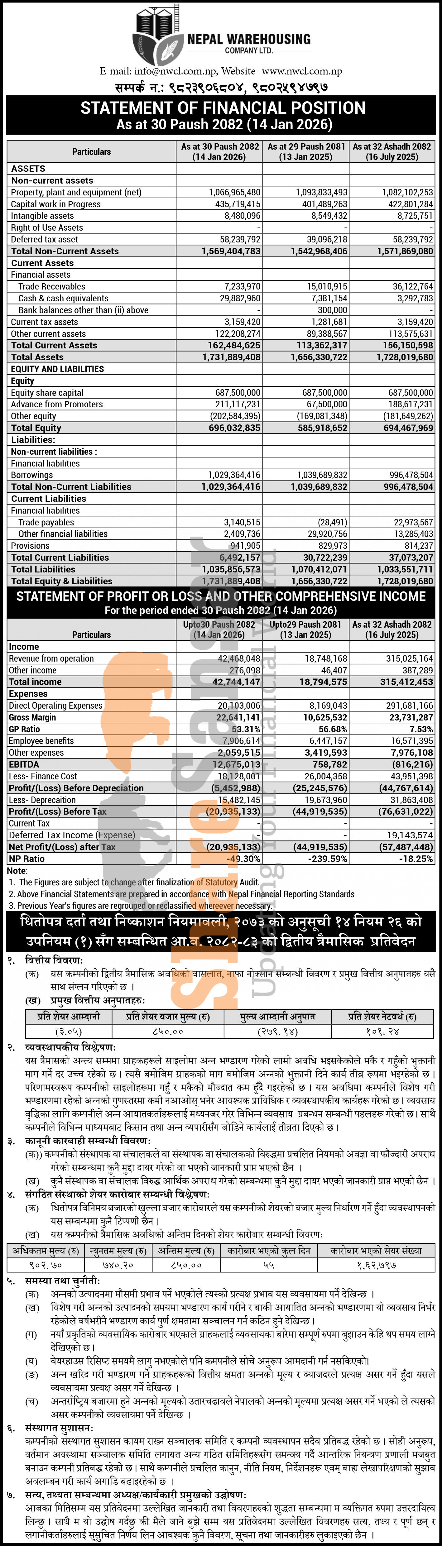 Nepal Warehousing Company Limited has posted a net loss of Rs 20.93 million and published its 2nd quarter company analysis of the fiscal year 2082/83.