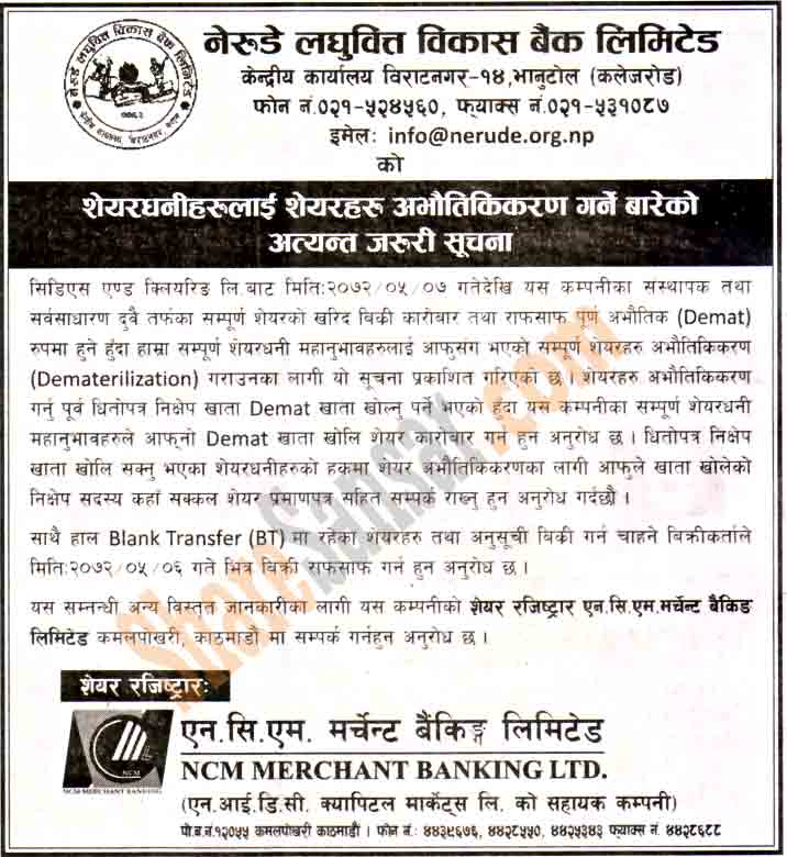 Nerude Laghubitta Bikas Bank Limited urges its shareholders to dematerialize their securities.