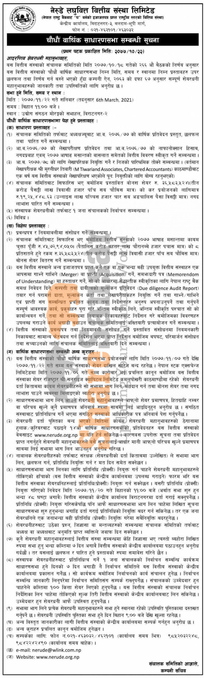 Nerude Laghubitta Bittiya Sanstha Limited has announced its 14th AGM going to be held on 22nd Falgun, 2077.