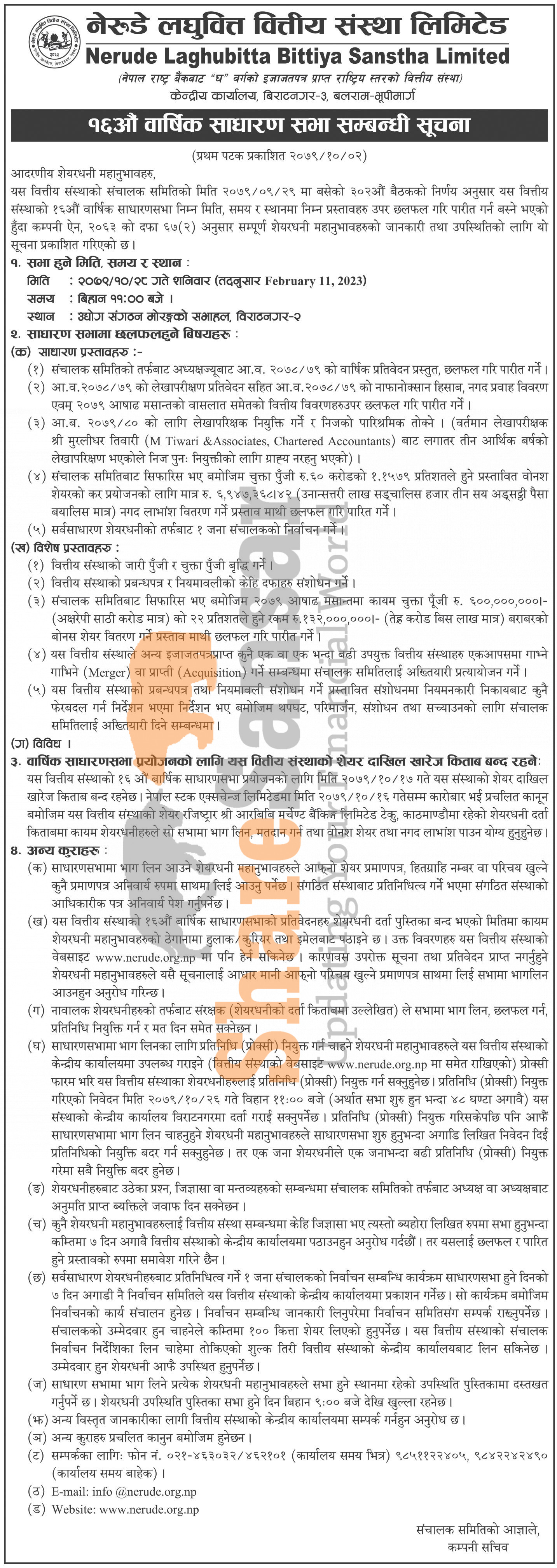 Nerude Laghubitta Bittiya Sanstha Limited has announced its 16th AGM going to be held on 28th Magh, 2079.