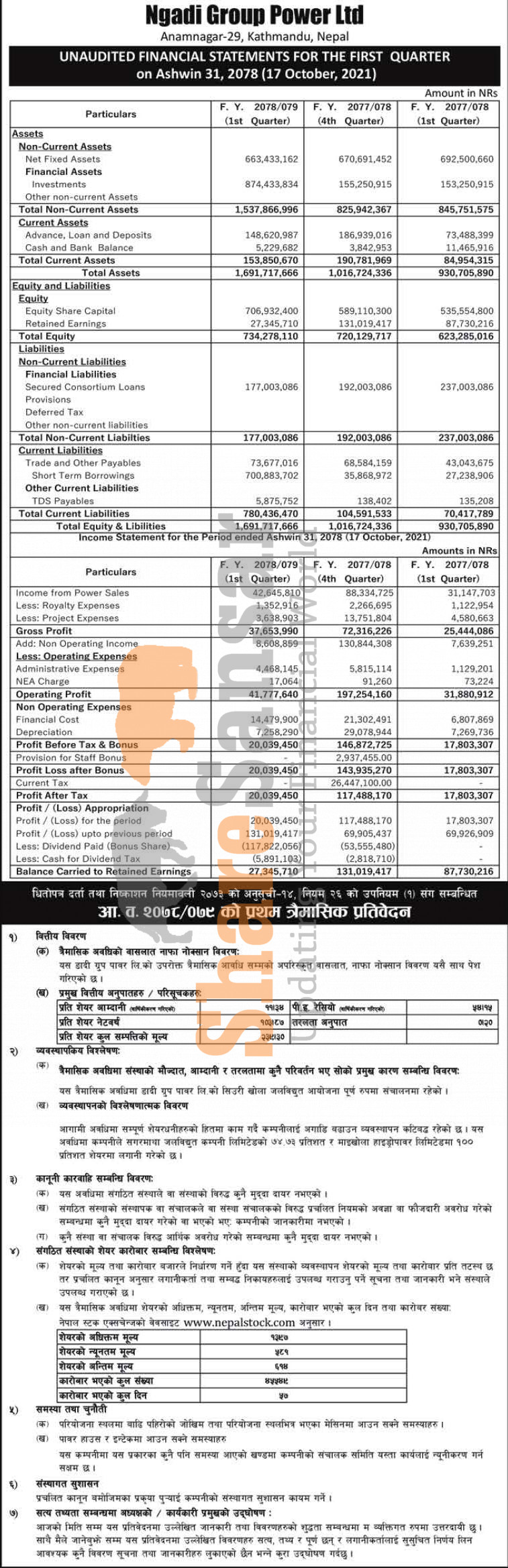 Ngadi Group Power Limited has posted a net profit of Rs 20.03 million and published its 1st quarter company analysis of the fiscal year 2078/79.