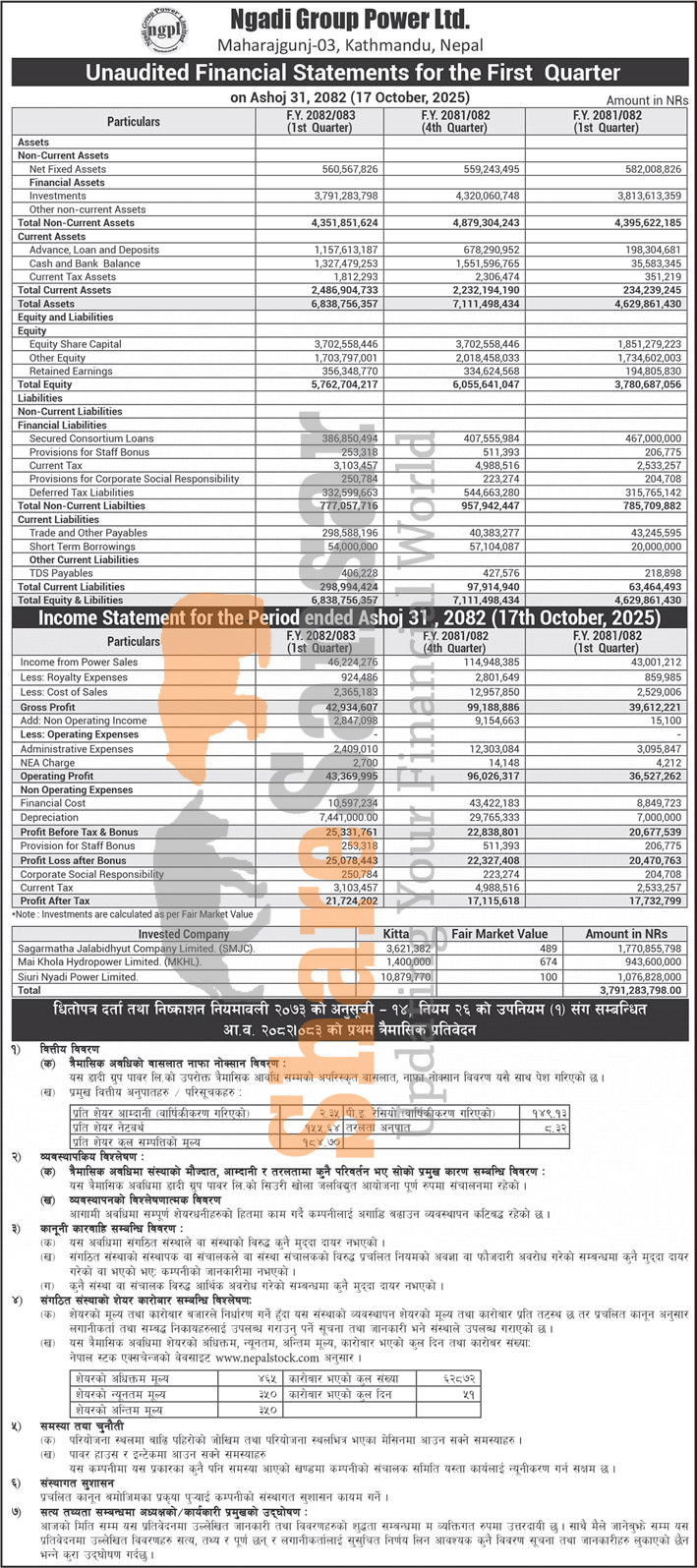 Ngadi Group Power Limited has posted a net profit of Rs 21.72 million and published its 1st quarter company analysis of the fiscal year 2082/83.