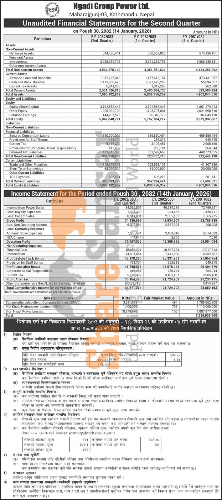 Ngadi Group Power Limited has posted a net profit of Rs 36.16 million and published its 2nd quarter company analysis of the fiscal year 2082/83.