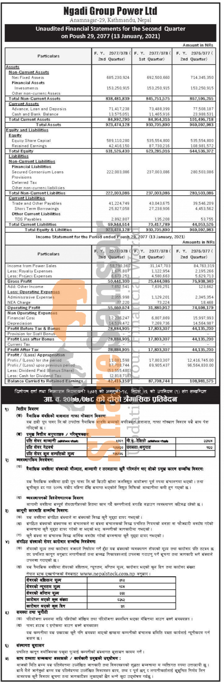 Ngadi Power Group Limited has posted a net profit of Rs 28.88 million and published its 2nd quarter company analysis of the fiscal year 2077/78.