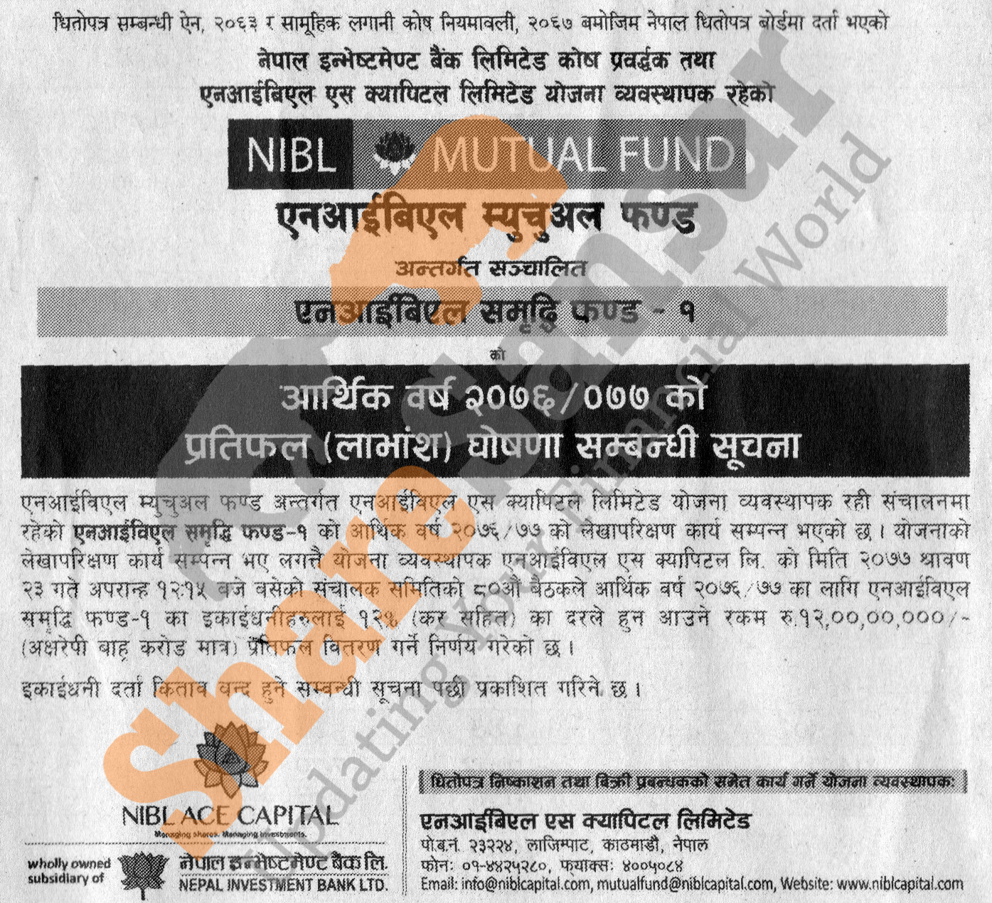 NIBL Ace Capital Limited has published a notice regarding the distribution of "NIBL Samriddhi Fund 1" 12% cash dividend to its unitholders.