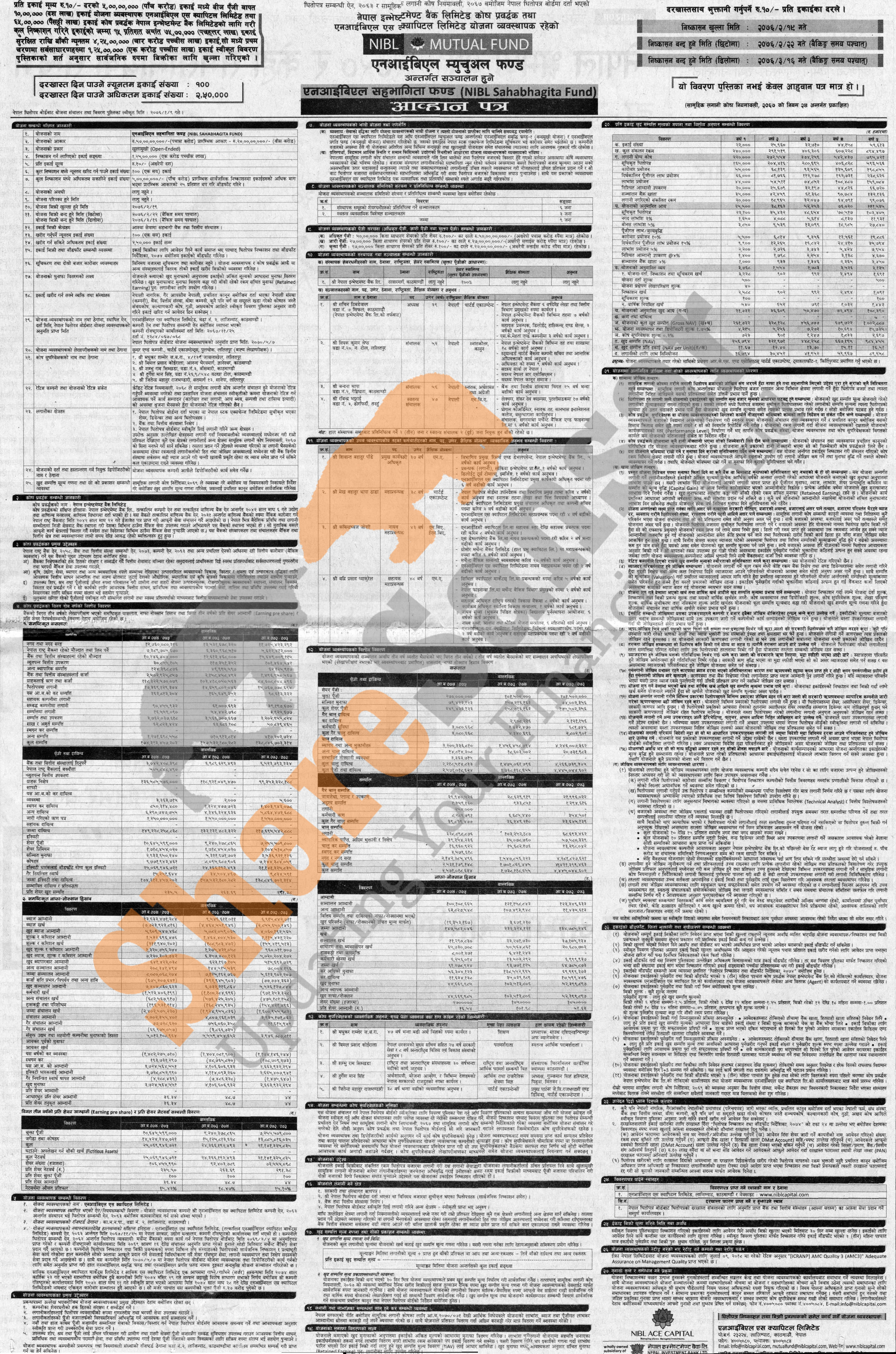NIBL Ace Capital Limited has published an offer letter to issue 12.5 million units of Rs 10 face value each mutual fund scheme worth Rs 125 million (NIBL Sahabhagita Fund) to the general public from (19th to 22nd Jestha, 2076).