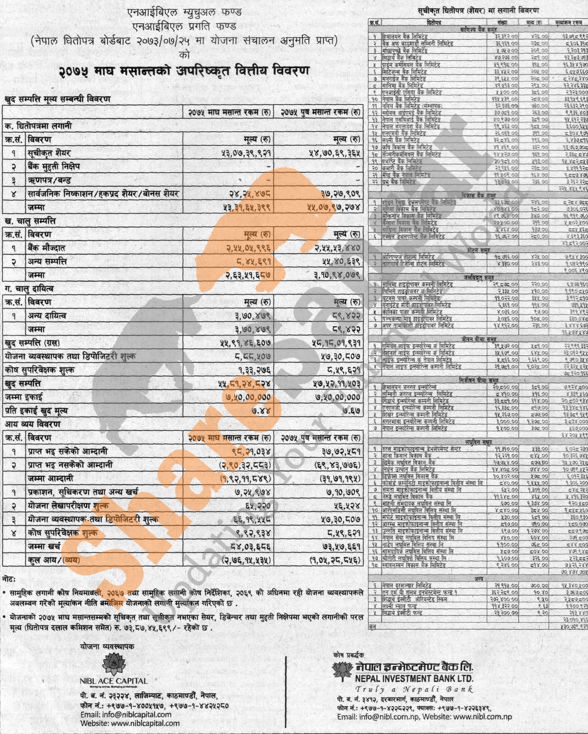 NIBL Ace Capital Limited has published “NIBL Pragati Fund” Net Assets Value (NAV) till Magh, 2075.