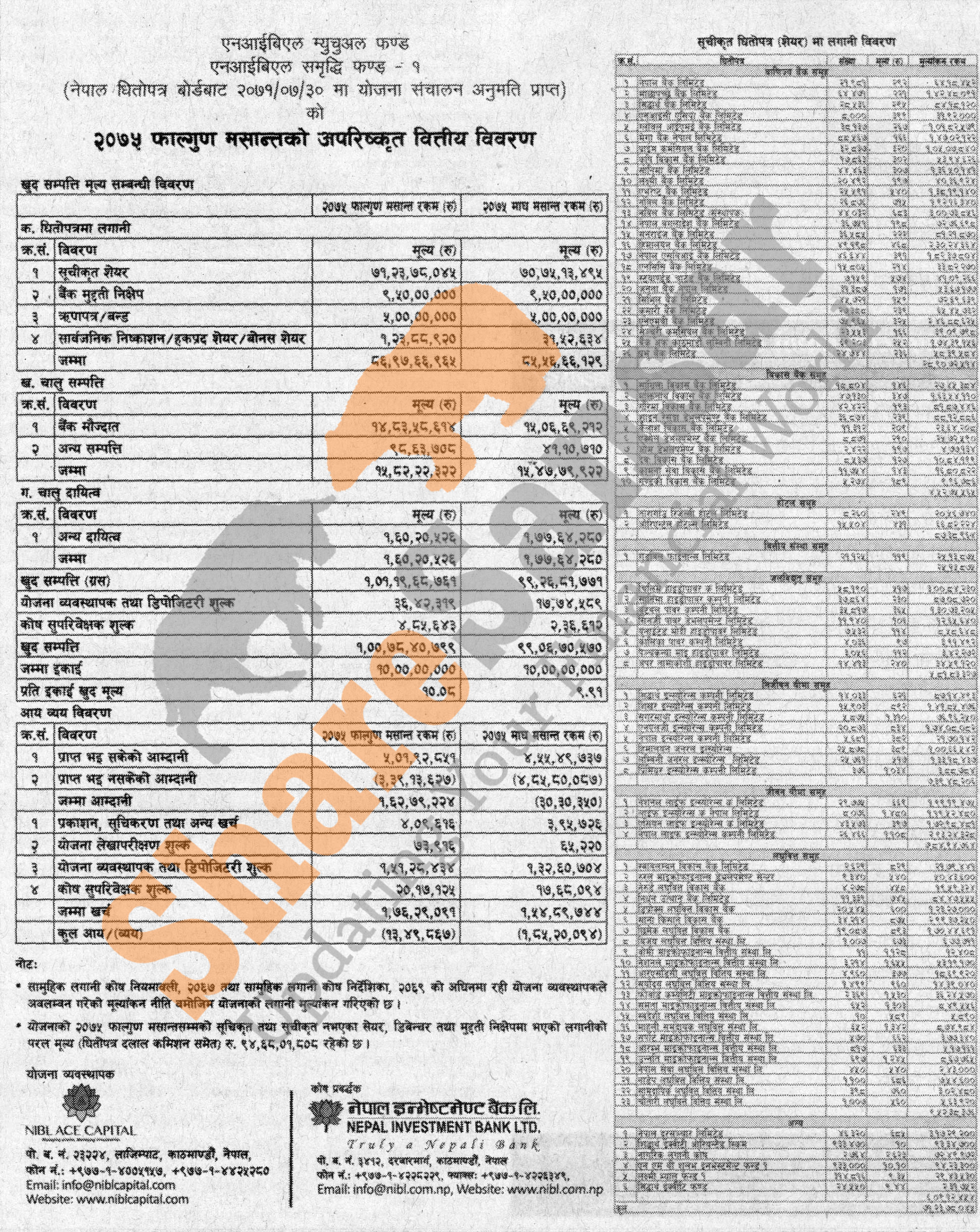 NIBL Ace Capital Limited has published “NIBL Samriddhi Fund-1” Net Assets Value (NAV) till Falgun, 2075.