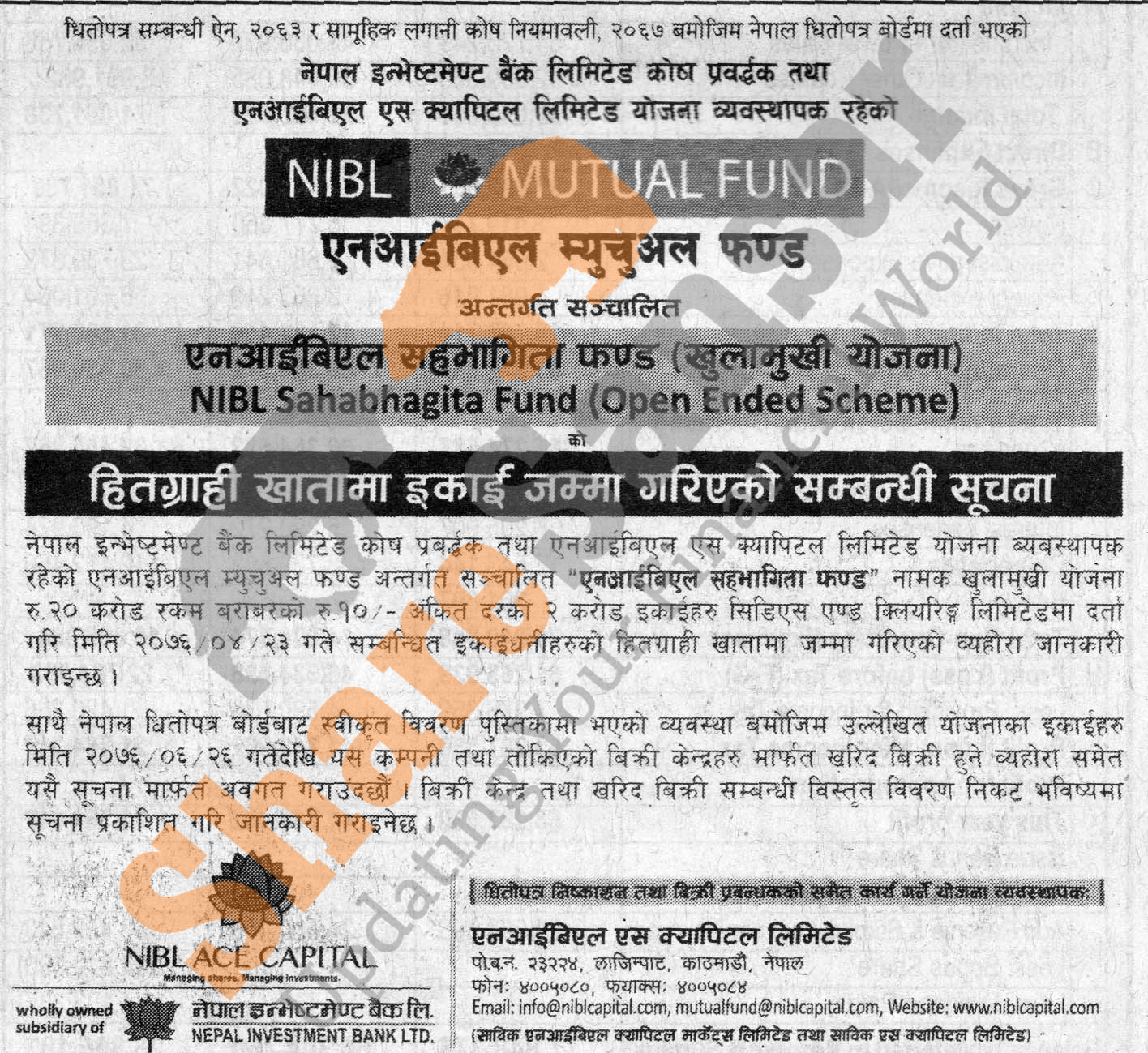 NIBL Ace Capital Limited is distributing (NIBL Sahabhagita Fund) 20 million units of Rs 10 face value each mutual fund scheme worth Rs 200 million directly to the DMAT accounts from 23rd Shrawan , 2076.