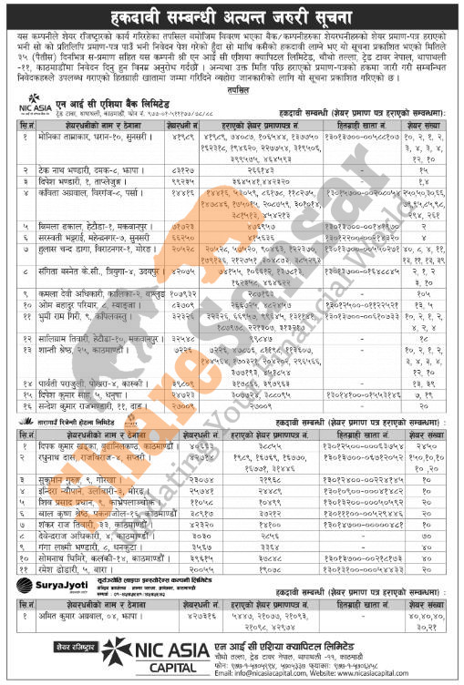 NIC Asia Bank Limited has published a notice regarding a claim for lost share certificates.
