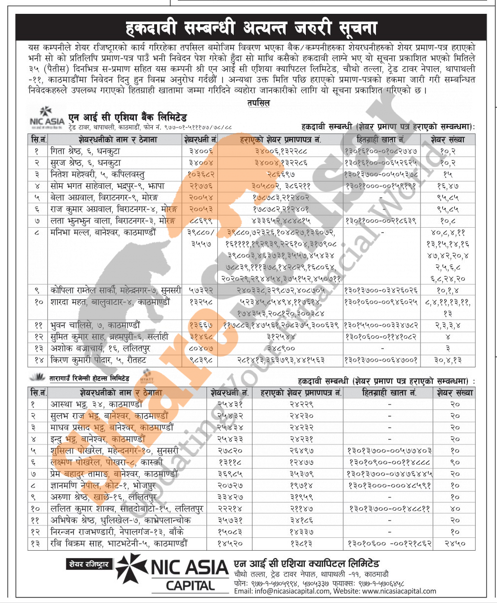NIC Asia Bank Limited has published a notice regarding a claim for lost share certificates.