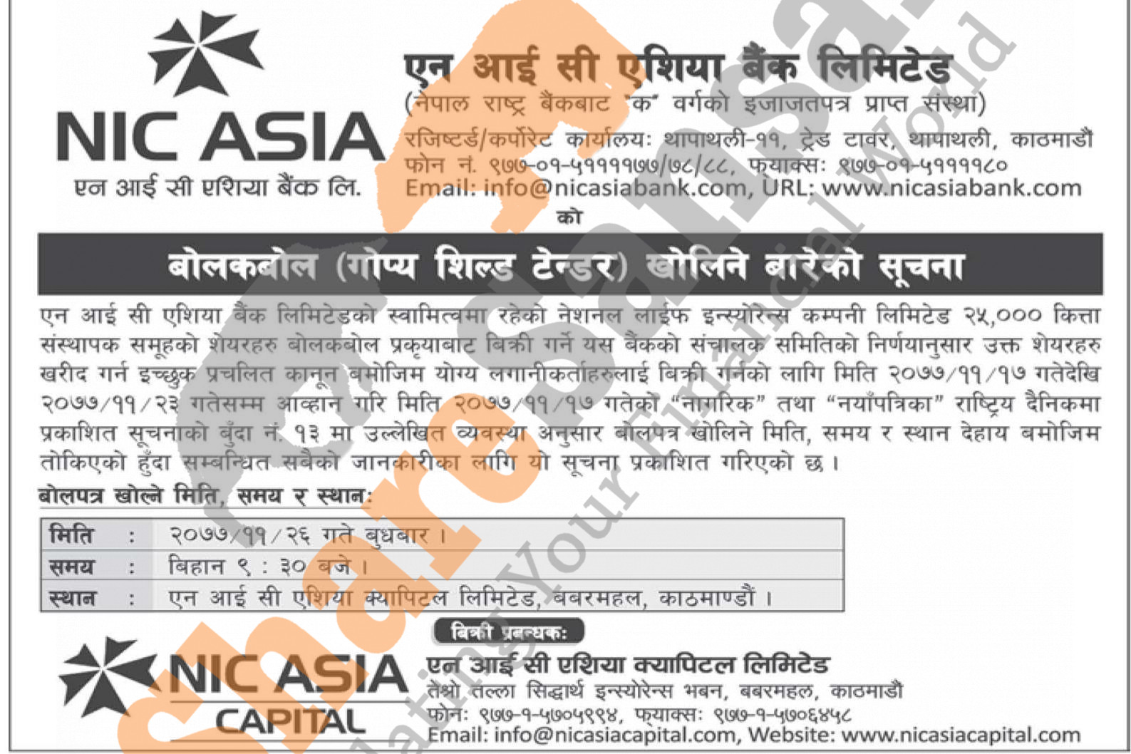NIC Asia Bank Limited has published a notice regarding bid opening date of 25,000 units promoter shares of (National Life Insurance Company Limited) in auction to the general public on 26th Falgun, 2077 (Today).