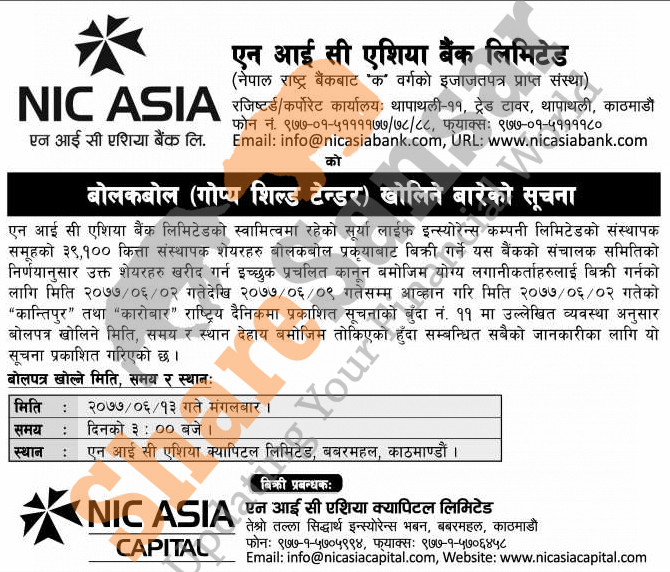 NIC Asia Bank Limited has published a notice regarding bid opening date of 39,100 units promoter share of (Surya Life Insurance Company Limited) in the auction to the general public on (13th Bhadra, 2077).