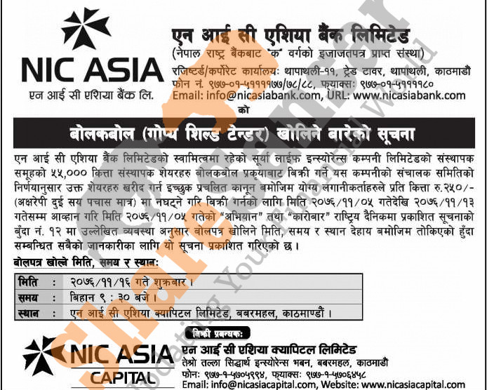 NIC Asia Bank Limited has published a notice regarding bid opening date of 55,000 units promoter shares of (Surya Life Insurance Company Limited) in auction to the general public on (16th Falgun, 2076).