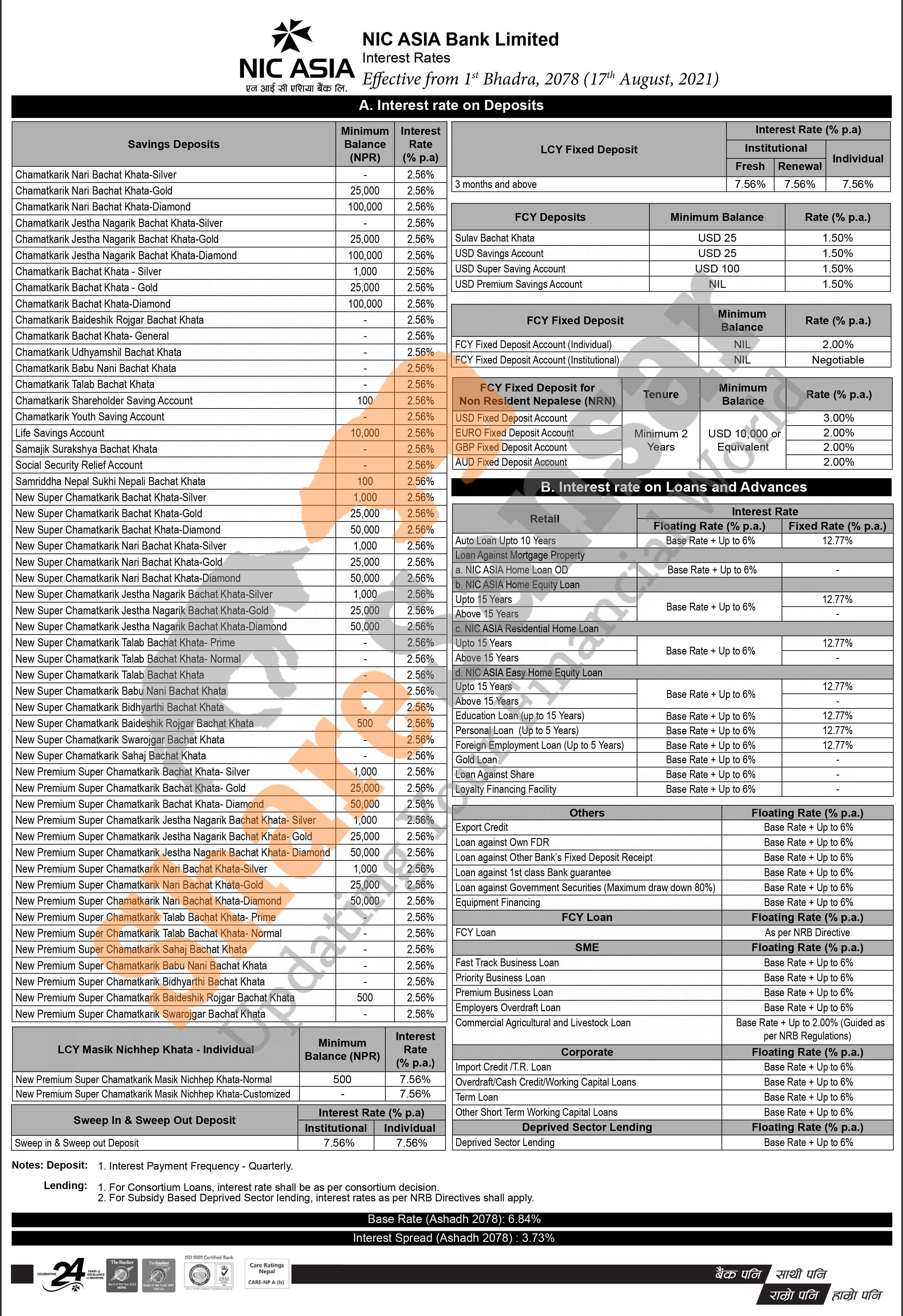 NIC Asia Bank Limited has published a notice regarding the new interest rate for deposit and loan products and it's effective from 1st Bhadra, 2078.