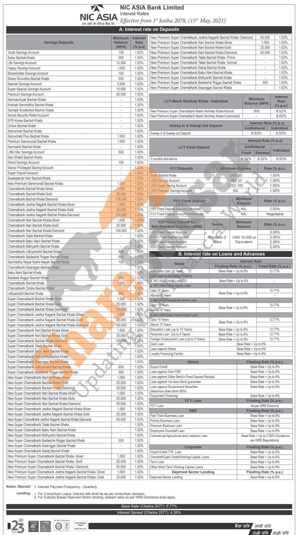 NIC Asia Bank Limited has published a notice regarding the new interest rate for deposit and loan products and it's effective from 1st Jestha, 2078.