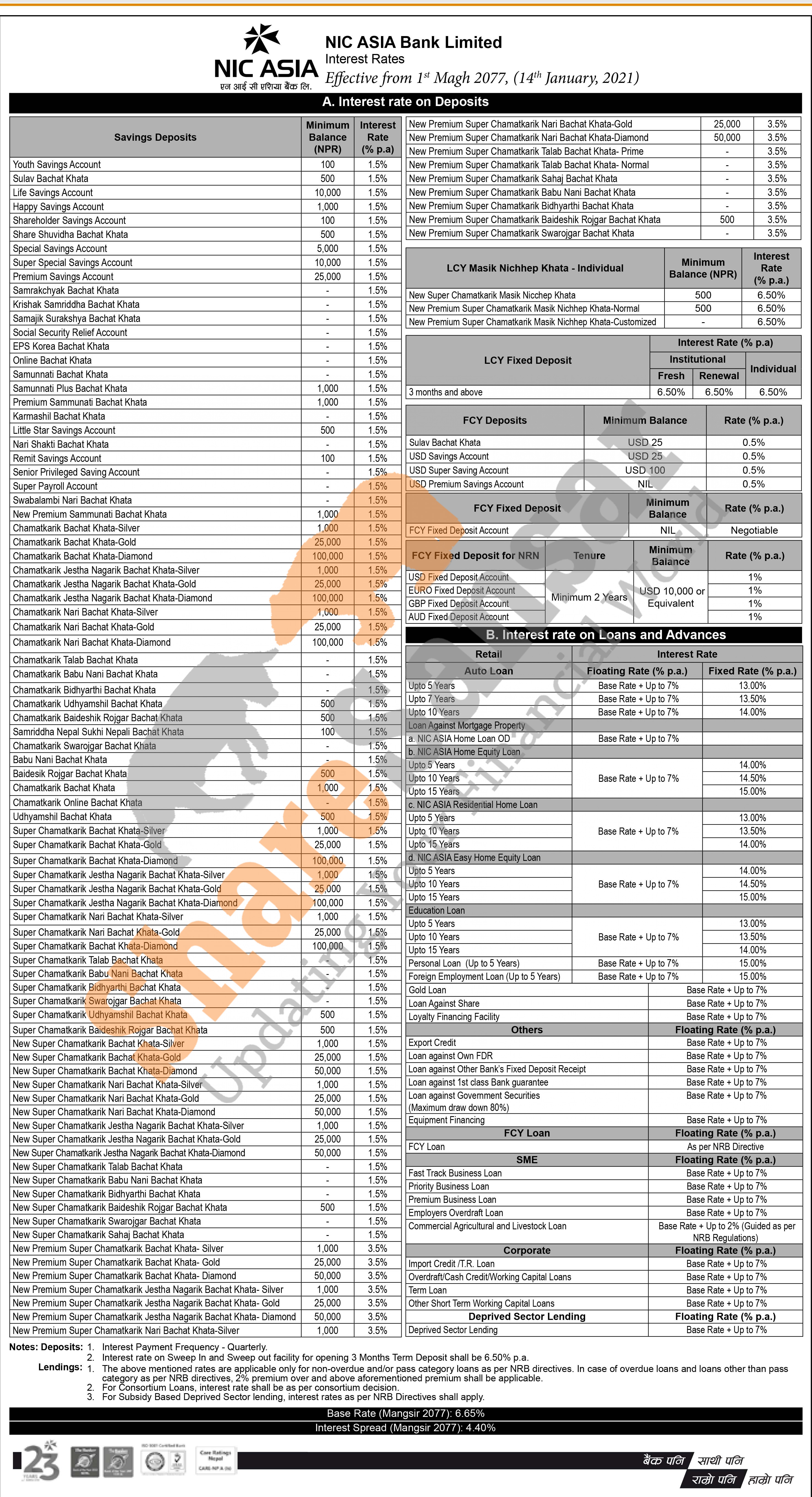 NIC Asia Bank Limited has published a notice regarding the new interest rate for deposit and loan products and it's effective from 1st Magh, 2077.