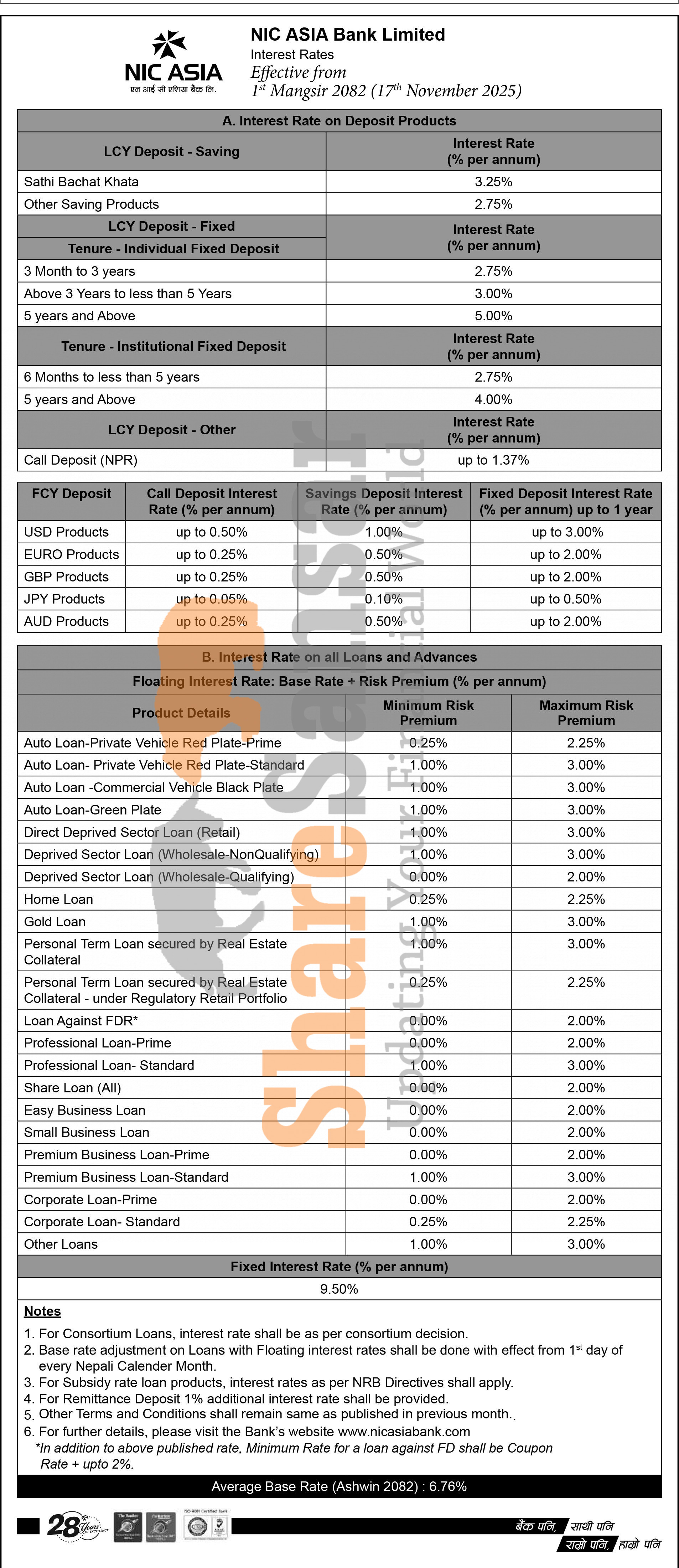 NIC Asia Bank Limited has published a notice regarding the new interest rate for deposit and loan products and it's effective from 1st Mangsir, 2082.