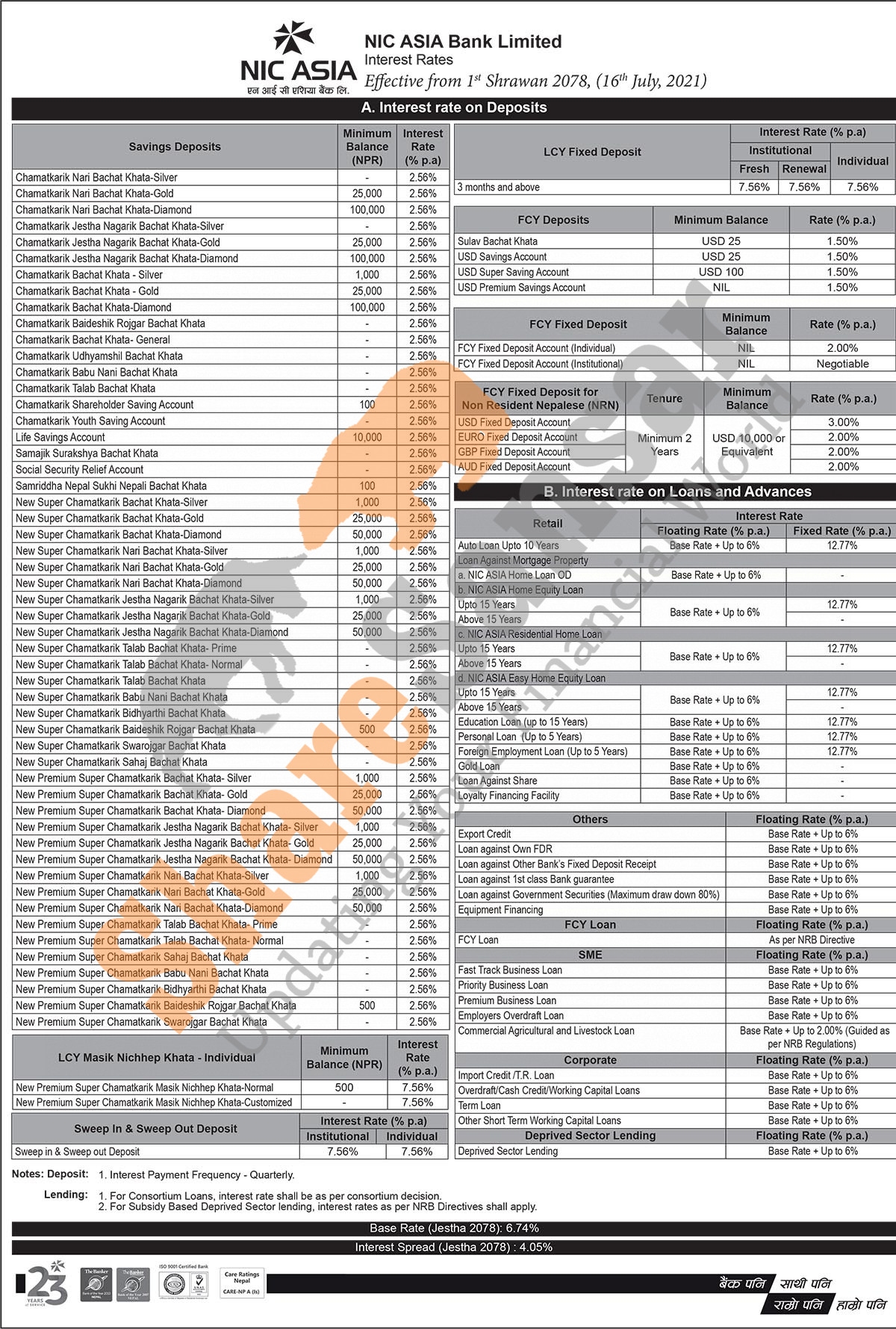 NIC Asia Bank Limited has published a notice regarding the new interest rate for deposit and loan products and it's effective from 1st Shrawan, 2078.