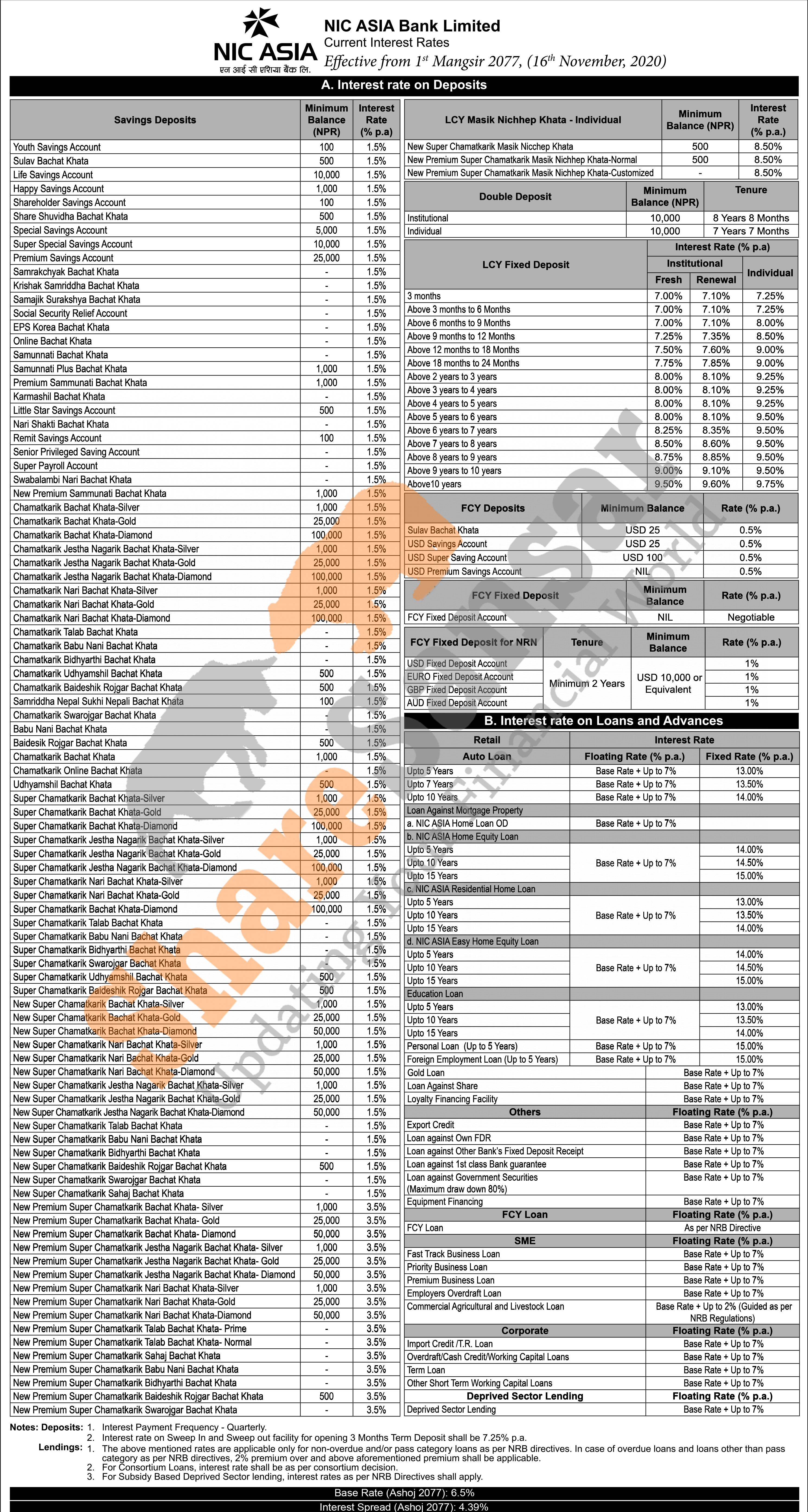 NIC Asia Bank Limited has published a notice regarding the new interest rate for its deposit products and loan and it's effective from 1st Mangsir, 2077.