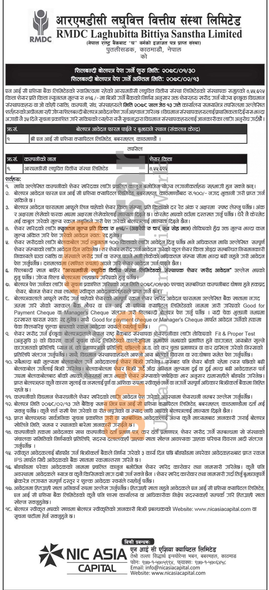 NIC Asia Bank Limited is going to auction 4,55,695 units promoter share of RMDC Laghubitta Bittiya Sanstha Limited to general public from 30th Baisakh to 13th Jestha, 2078.