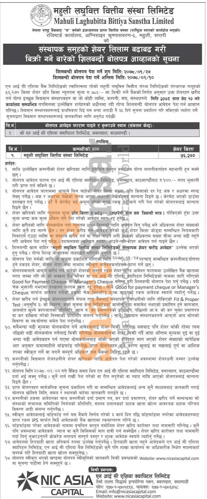 NIC Asia Bank Limited is going to auction 56,270 units promoter shares of (Mahuli Laghubitta Bittiya Sanstha Limited) from 27th Baisakh to 10th Jestha, 2078.
