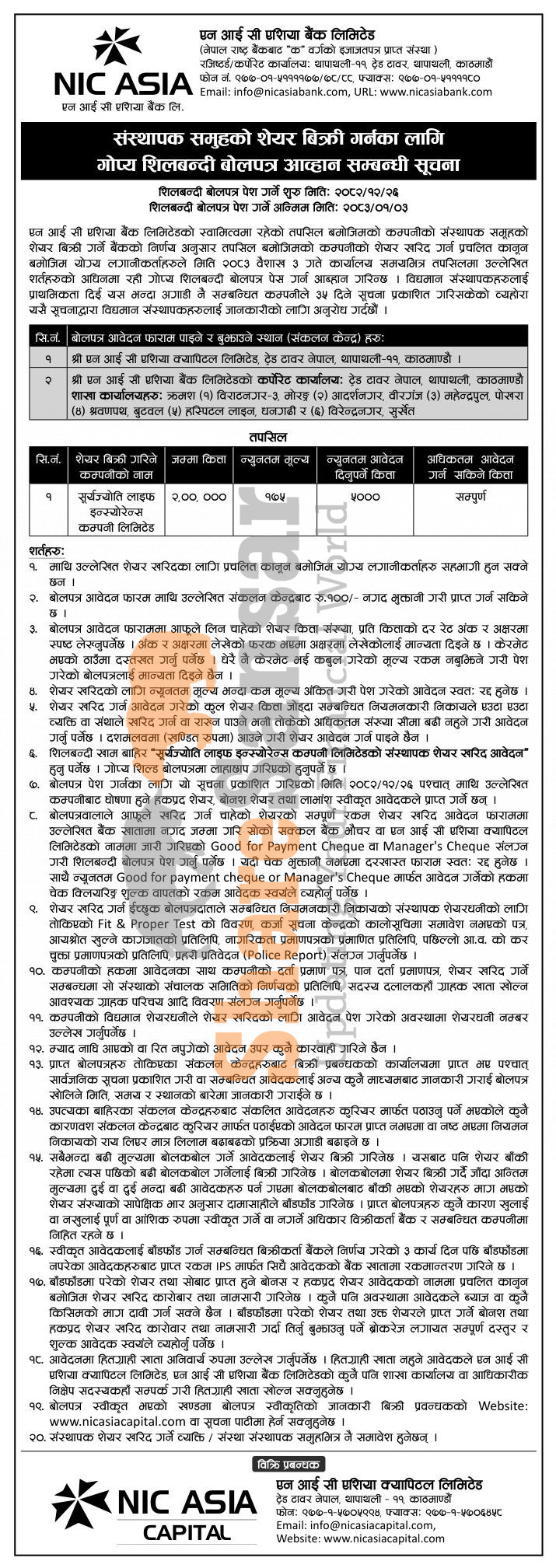 NIC Asia Bank Limited is selling 2,00,000 units promoter shares of SuryaJyoti Life Insurance Company Limited in an auction to the qualified investors from 26th Chaitra, 2082 to 3rd Baisakh, 2083.