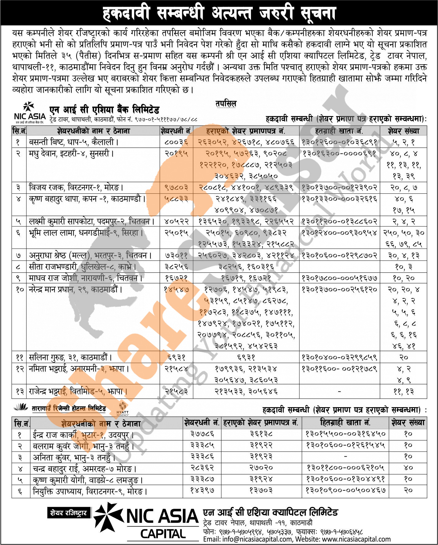 NIC Asia Capital Limited has published a notice regarding a claim for lost share certificates.