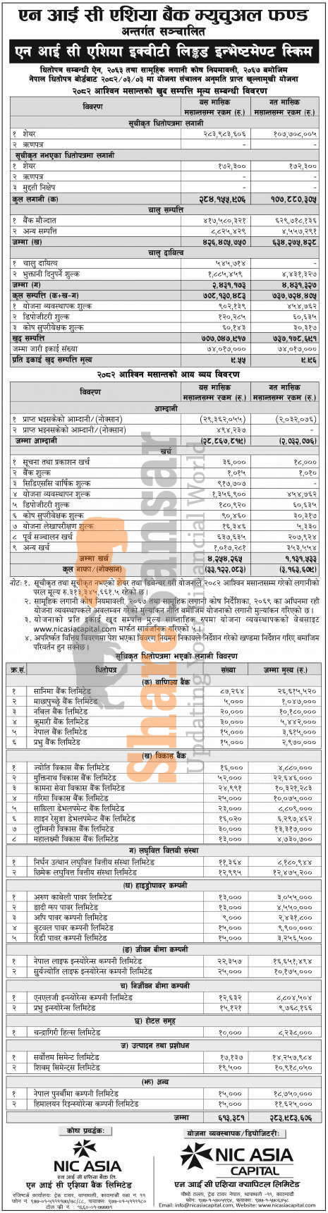 NIC Asia Capital Limited has published "NIC ASIA Equity Linked Investment Scheme" Net Assets Value (NAV) till Ashwin, 2082.