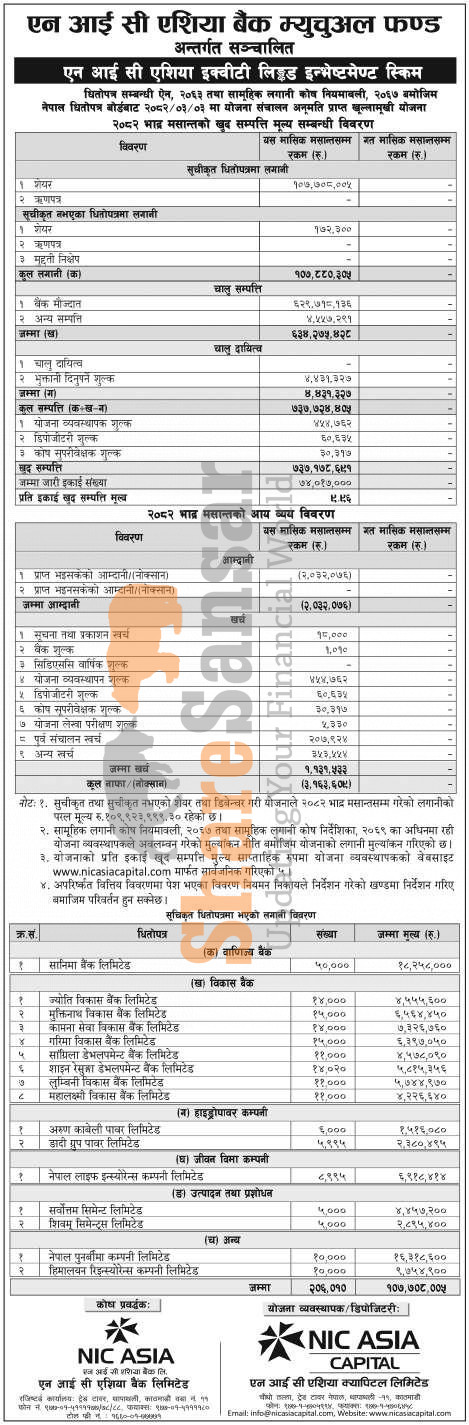 NIC Asia Capital Limited has published "NIC ASIA Equity Linked Investment Scheme" Net Assets Value (NAV) till Bhadra, 2082.