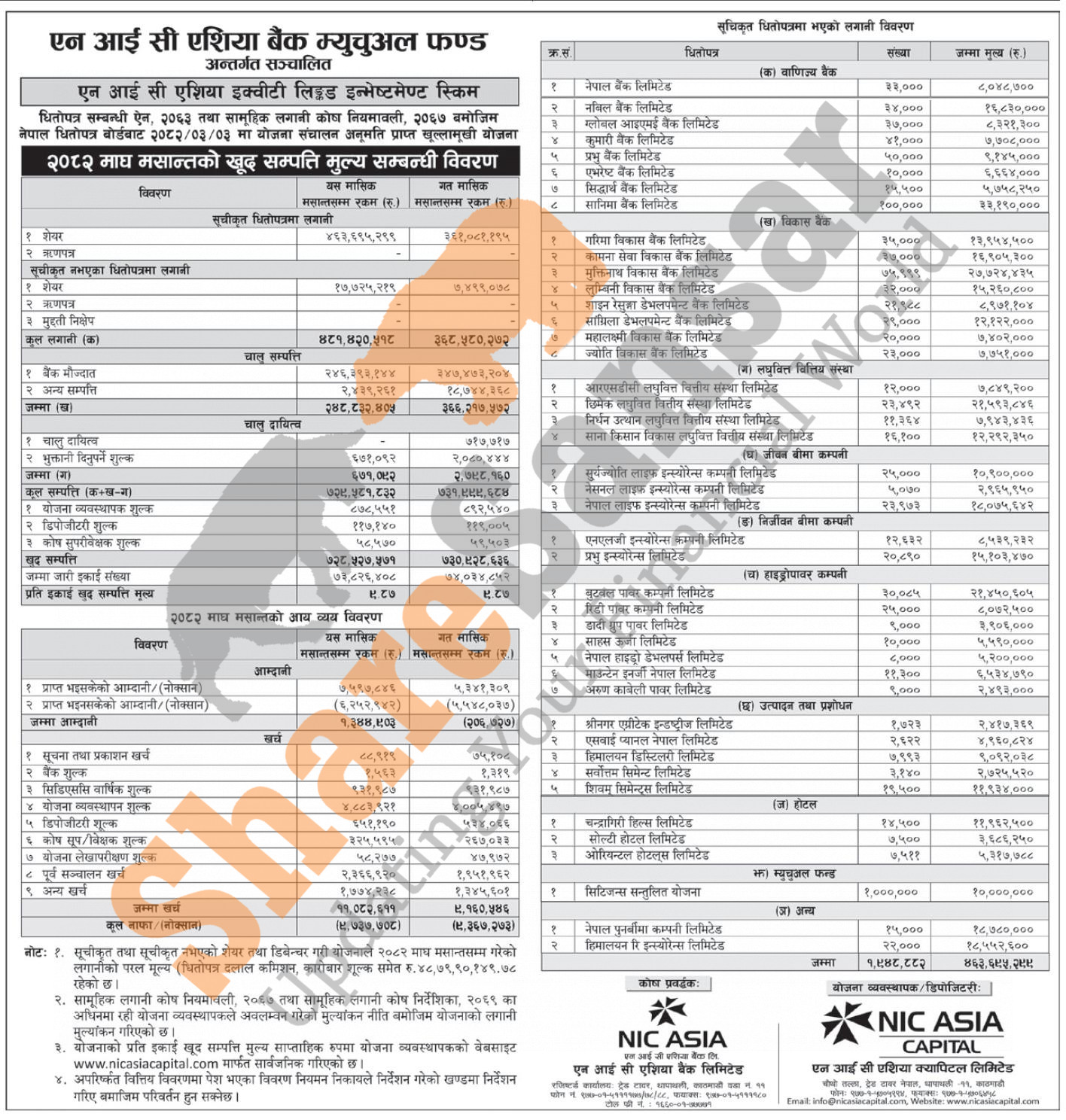 NIC Asia Capital Limited has published "NIC ASIA Equity Linked Investment Scheme" Net Assets Value (NAV) till Magh, 2082.