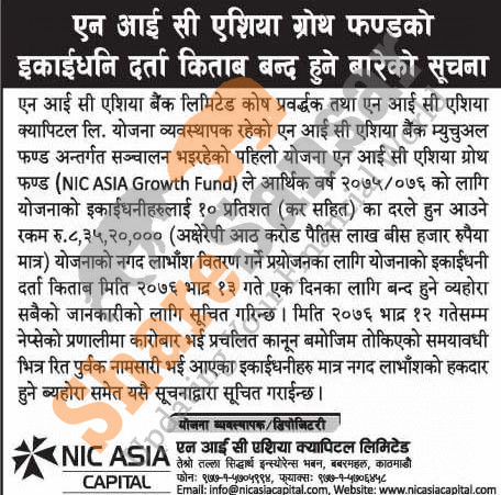 NIC Asia Growth Fund has announced a book closure date for distribution of dividend of fiscal year of 2075/76 on 13th Bhadra, 2076.