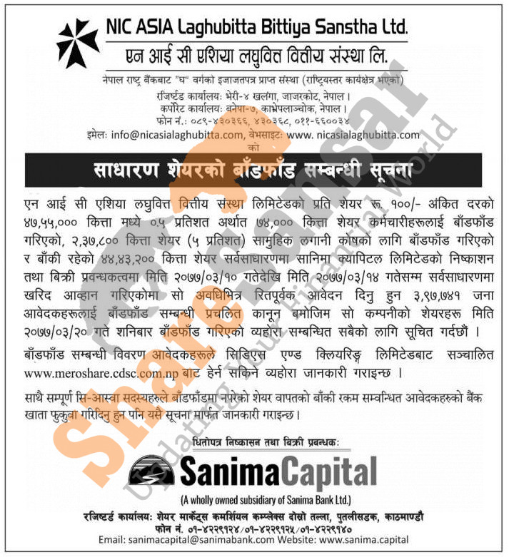 NIC Asia Laghubitta Bittiya Sanstha Limited has allotted its 47,55,000 units IPO shares to the general public, employees and mutual fund on 20th Ashad, 2077.