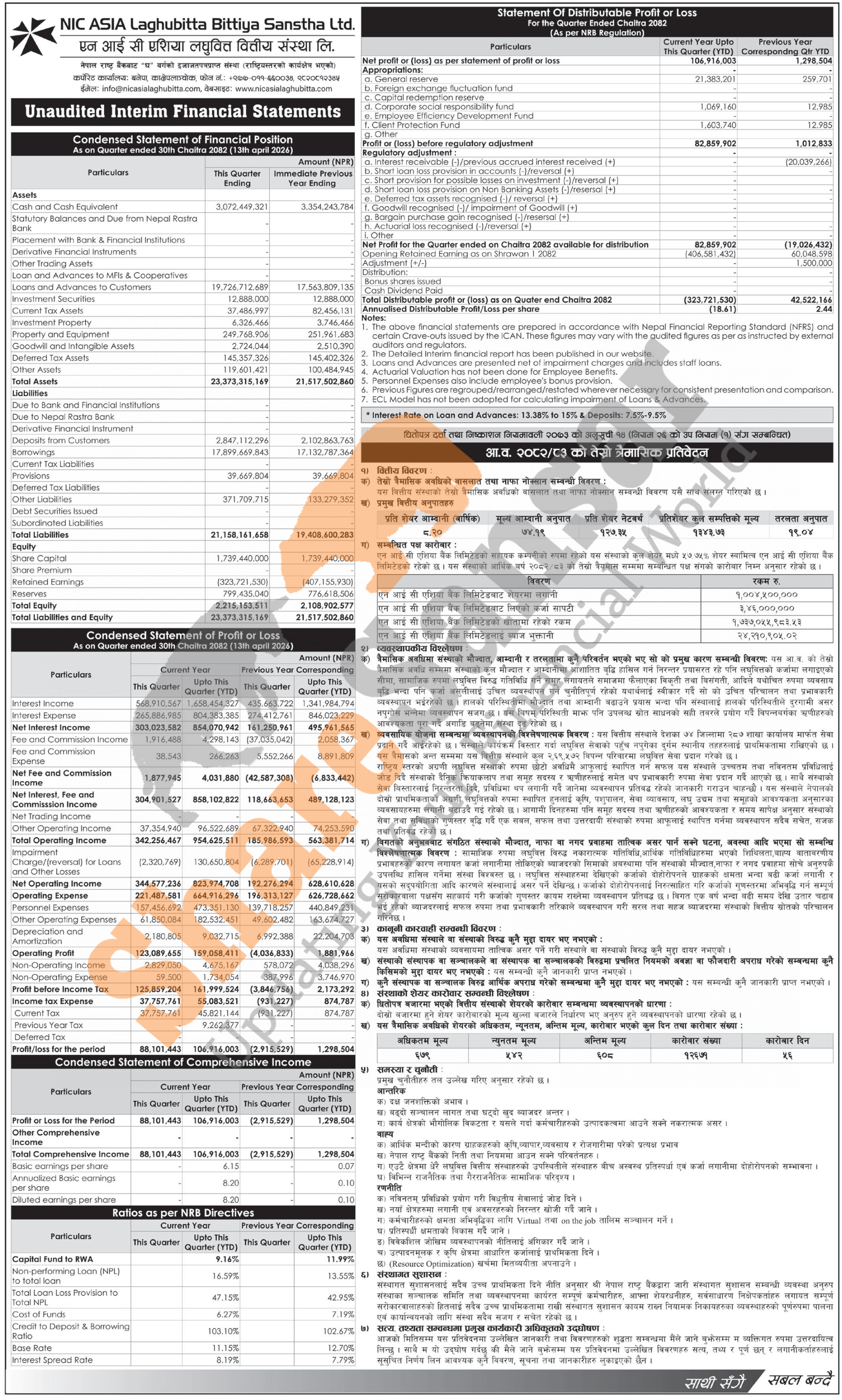 NIC Asia Laghubitta Bittiya Sanstha Limited has posted a net profit of Rs 106.91 million and published its 3rd quarter company analysis of the fiscal year 2082/83.