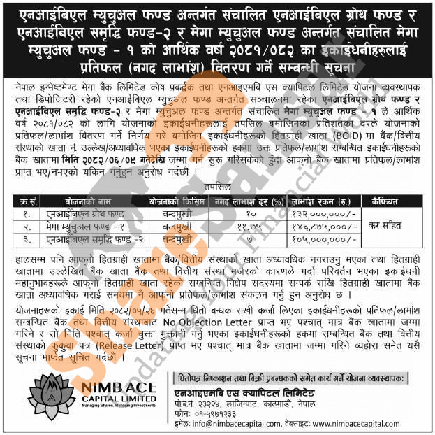 NIMB Ace Capital Limited has distributed return scheme to the unitholders of its "NIBL Growth Fund", "Mega Mutual Fund - 1" and "NIBL Samriddhi Fund - 2" and has urged them to update their bank accounts, DEMAT account and Permanent Account Number (PAN).